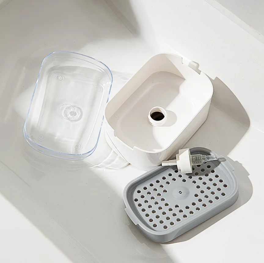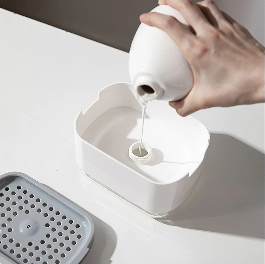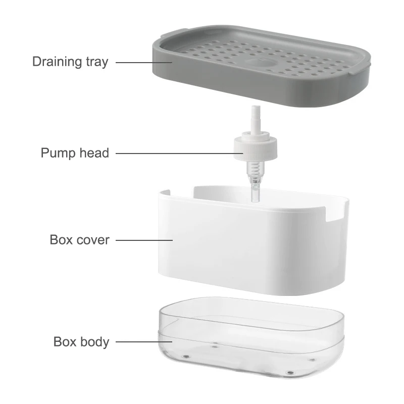 ป้องกันการรั่วซึมและทำความสะอาดง่าย: ที่กดน้ำยาล้างจานพร้อมที่วางฟองน้ำสามารถใช้แทนที่กดน้ำยาล้างจานแบบดั้งเดิมได้อย่างสมบูรณ์แบบ ด้านล่างของชั้นวางถาดถูกออกแบบให้มีลักษณะกลวงและป้องกันการรั่วซึม ช่วยให้สะดวกต่อการเก็บของเหลวที่เหลืออยู่เมื่อต้องการทำความสะอาด เพียงแค่ถอดชั้นวางถาดออกแล้วเทของเหลวที่อยู่ภายในออกมาทำความสะอาดได้เลย สะดวกมาก และยังเป็นของขวัญที่สมบูรณ์แบบสำหรับเพื่อนหรือครอบครัวของคุณ