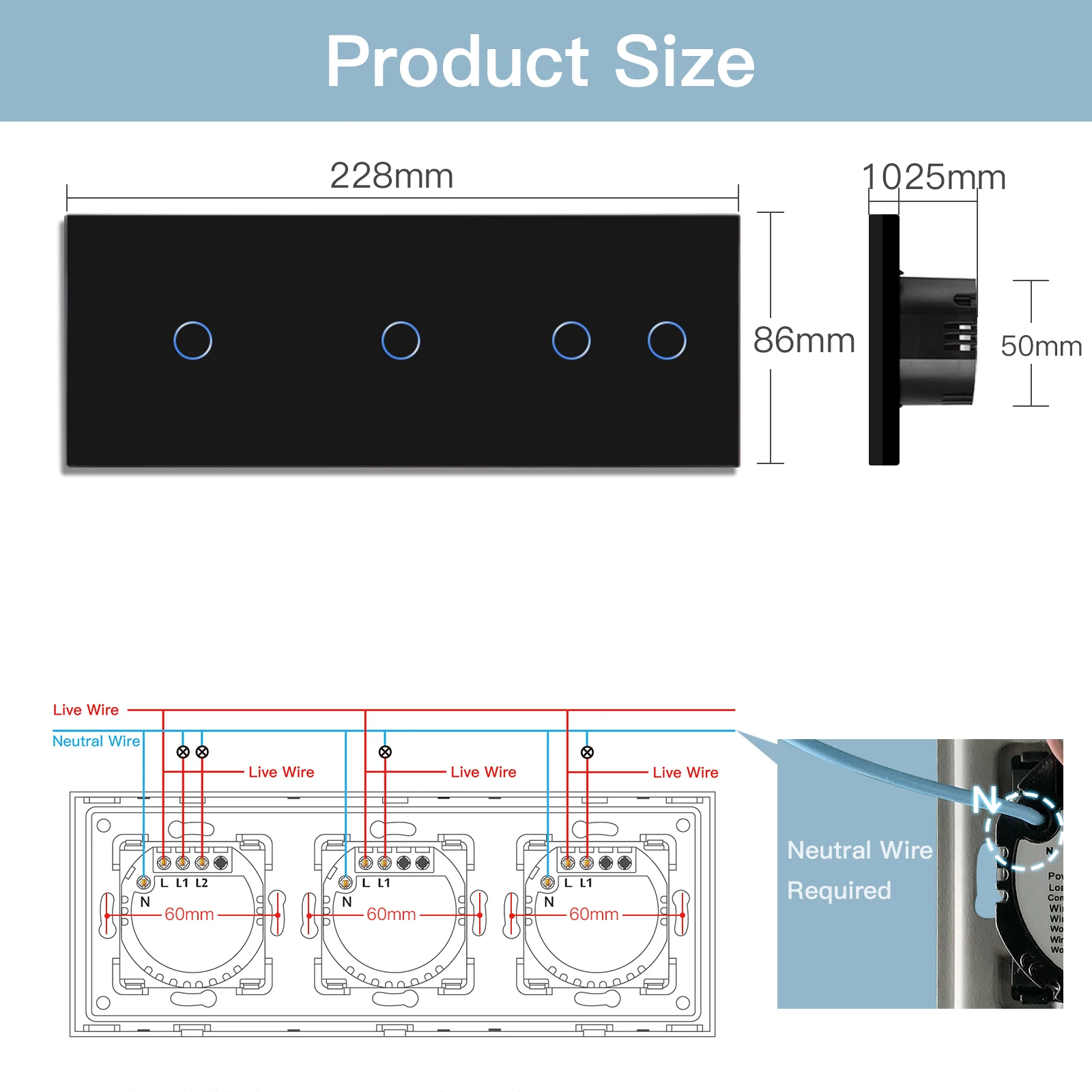 ลวดสีน้ำเงินหรือสีดำ (เป็นกลาง) จะเข้าสู่การเอียงทองเหลือง N หรือหลุม N ที่ด้านหลังของอุปกรณ์ แผงสามารถประกอบใหม่ได้อย่างง่ายดายสำหรับการเปลี่ยนชิ้นส่วนของหน่วยถ้าจำเป็น (จำเป็นต้องใช้ลวดเป็นกลาง)
