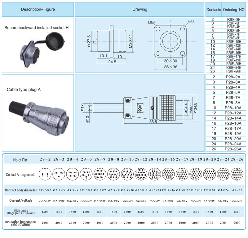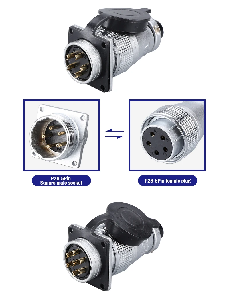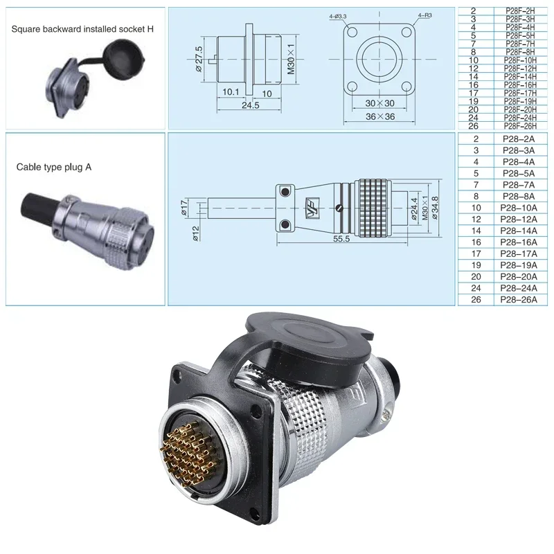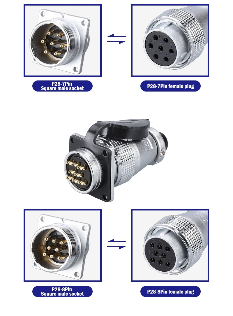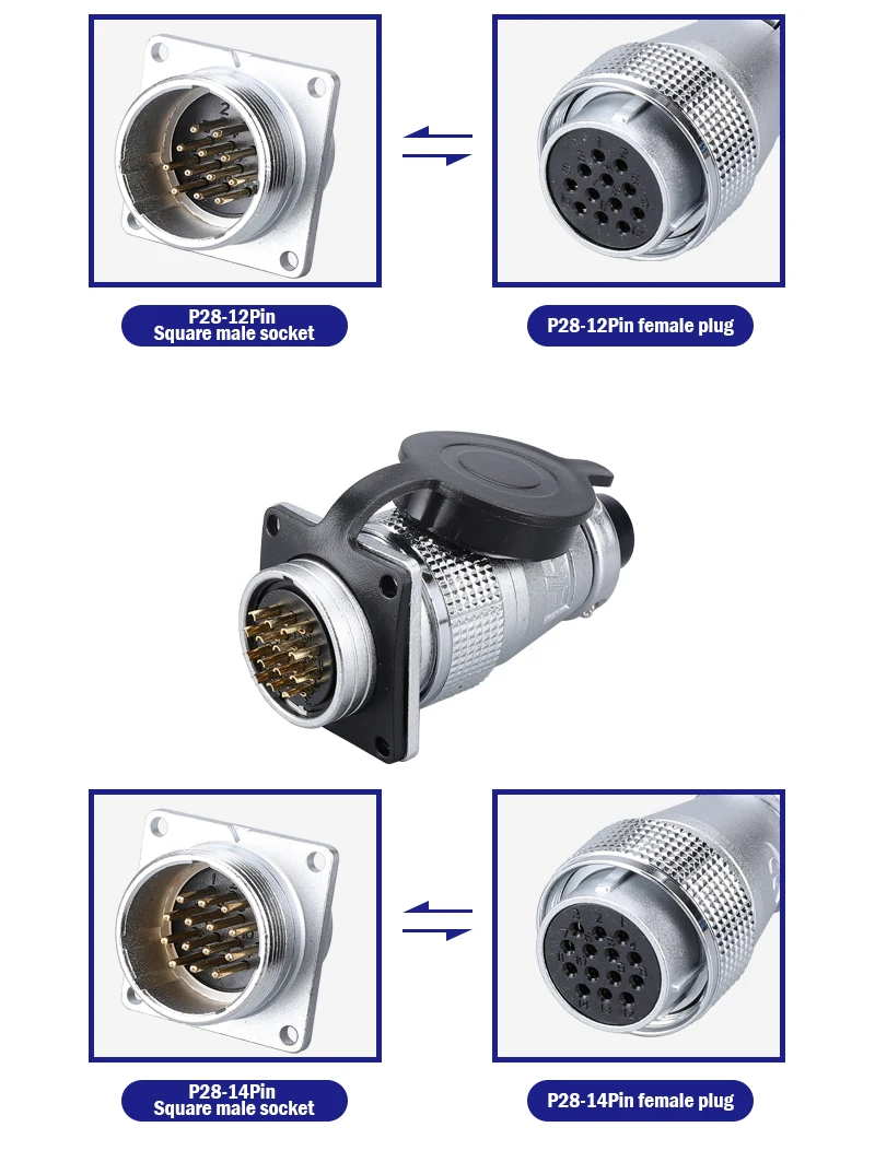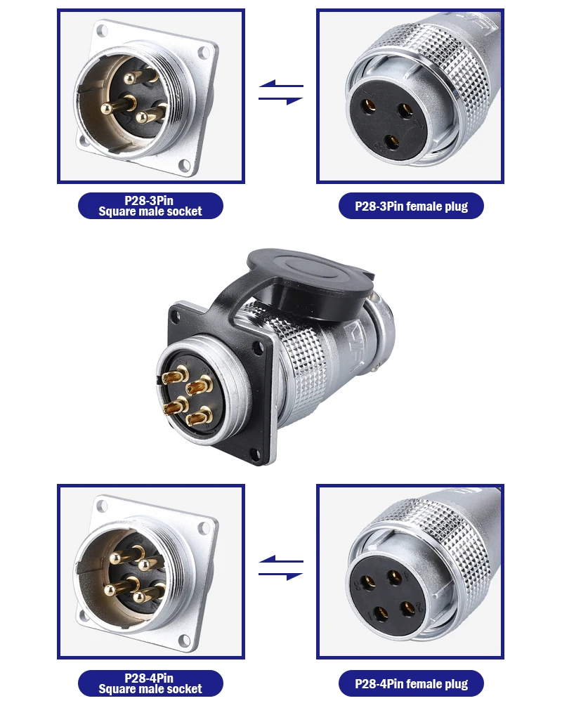 ขั้วต่อหลอดไฟ LED ปลั๊กสี่เหลี่ยมการบิน P28-วงกลม, ข้อต่อก้น, ชายและ Female.2/3/4/5/7/10/12/14/16/19/20/24ขา P28K2Q PLS28