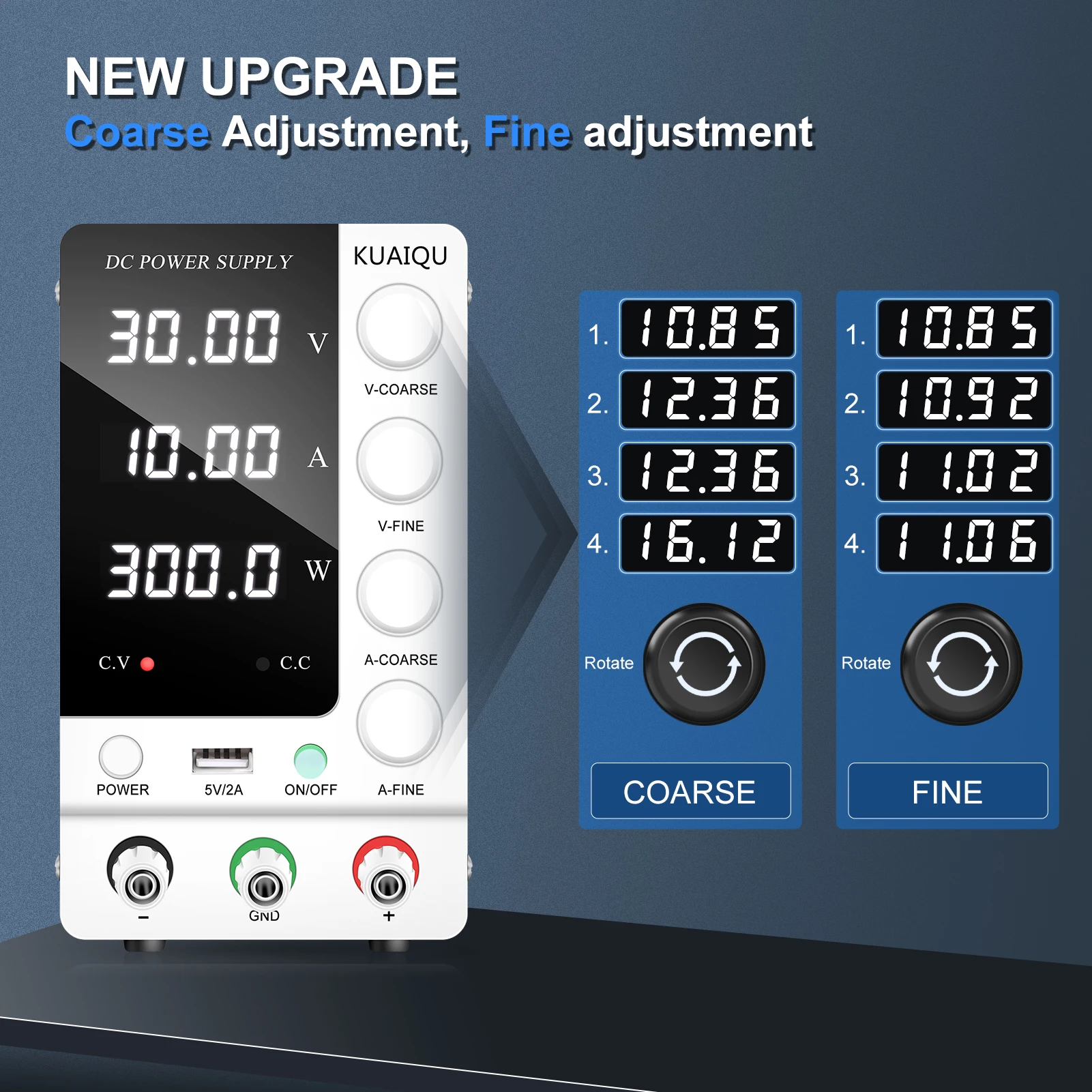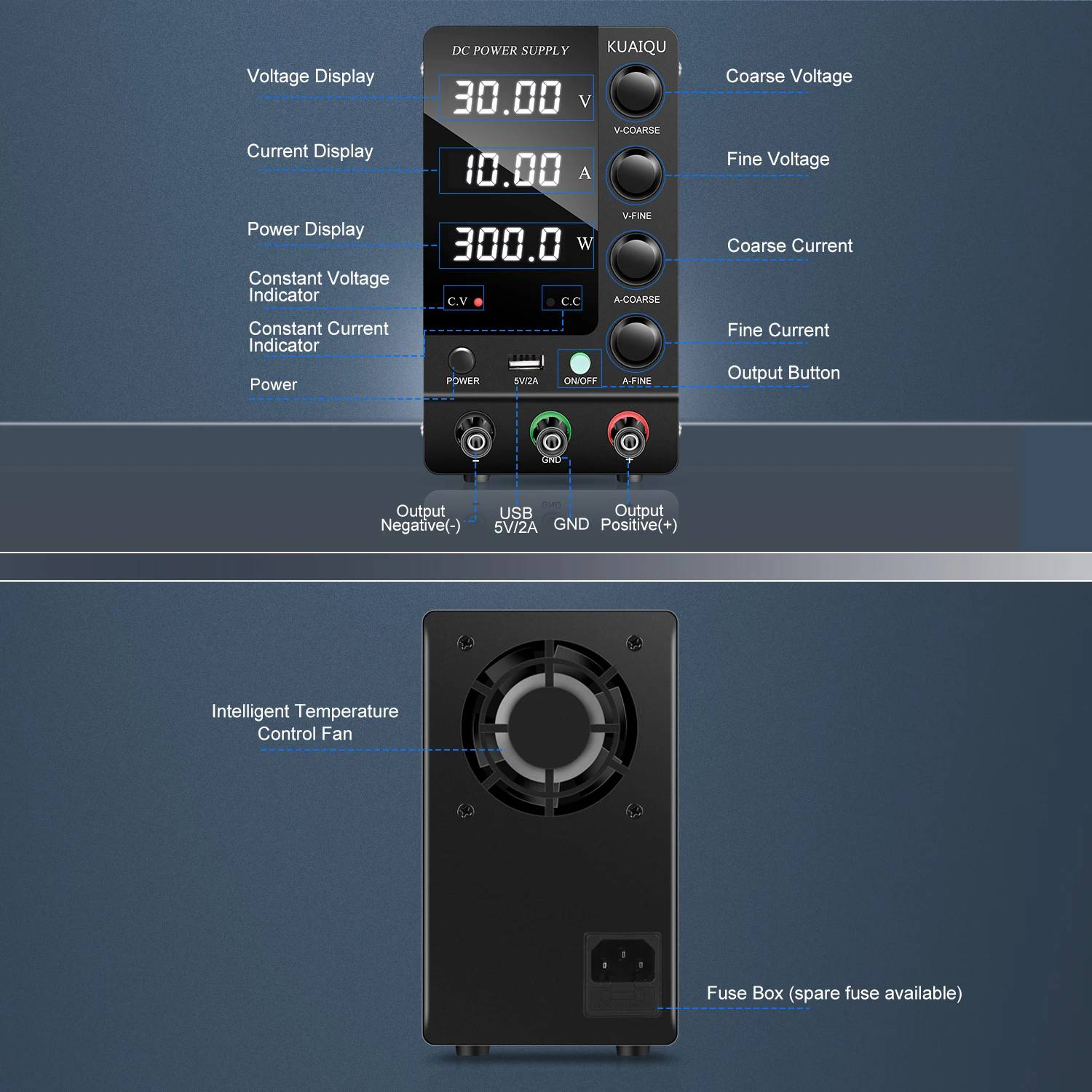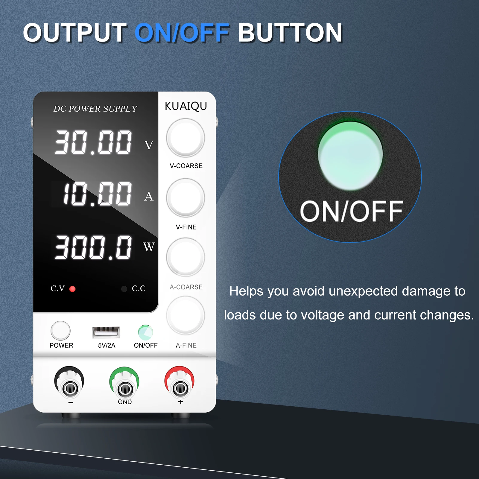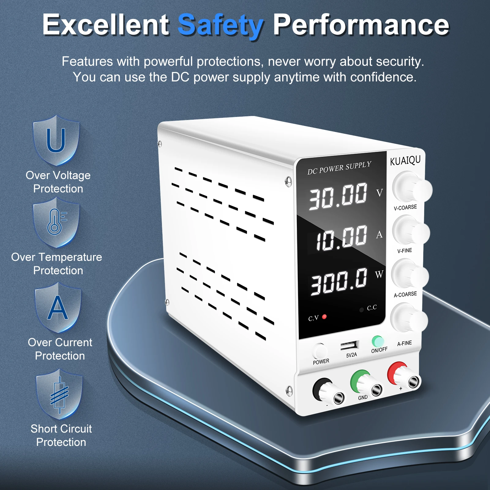 สวิตช์ไฟด้านหน้า ปุ่มปรับหยาบและละเอียดที่แม่นยำ: อัพเกรดจากแหล่งจ่ายไฟสลับแบบเก่า สวิตช์ไฟเวอร์ชันใหม่ล่าสุดอยู่ที่ด้านหน้าของแหล่งจ่ายไฟที่มีการควบคุม DC คุณไม่จำเป็นต้องหมุนไปด้านหลังเพื่อเปิด/ปิด ปิดแหล่งจ่ายไฟควบคุมการสลับที่ปรับได้ ใช้งานง่ายและสะดวกคุณสมบัติแหล่งจ่ายไฟแบบตั้งโต๊ะแบบควบคุม DC แบบสวิตชิ่งที่ปรับได้พร้อมปุ่มปรับแรงดันไฟฟ้า/กระแสไฟหยาบและละเอียดที่แม่นยำ คุณสามารถตั้งค่าแรงดันและกระแสที่ต้องการบนแหล่งจ่ายไฟแบบตั้งโต๊ะ KUAIQU ได้อย่างง่ายดาย