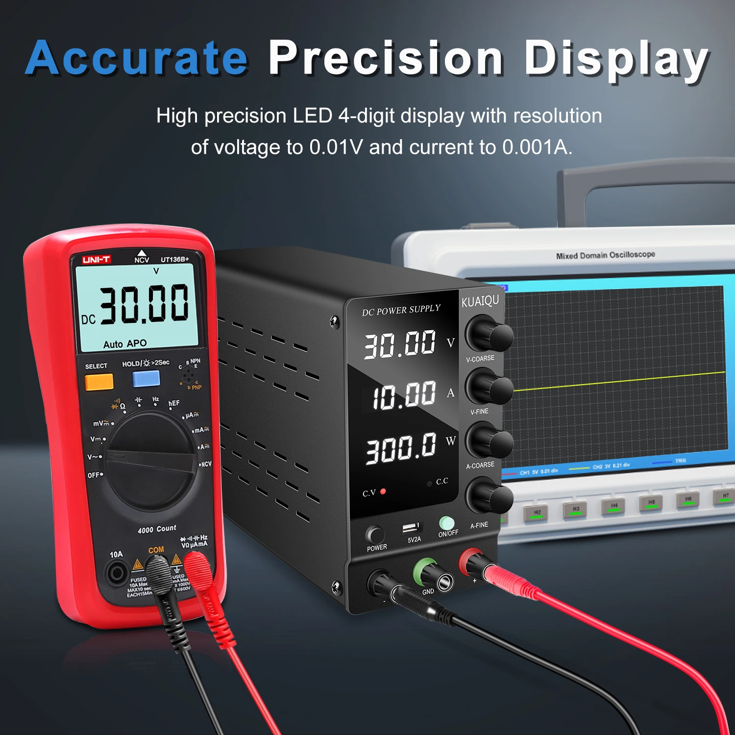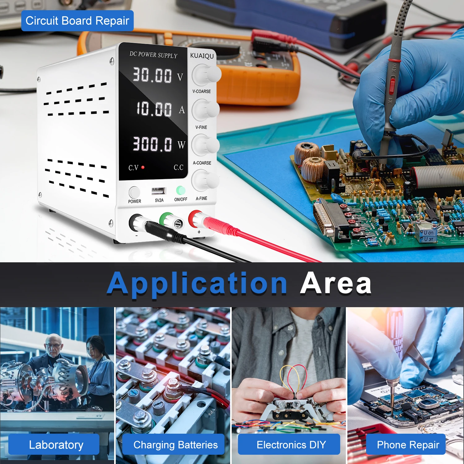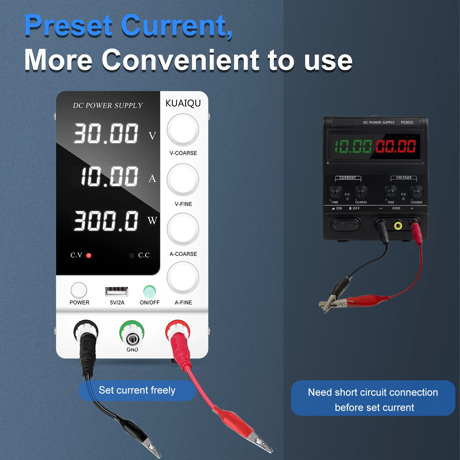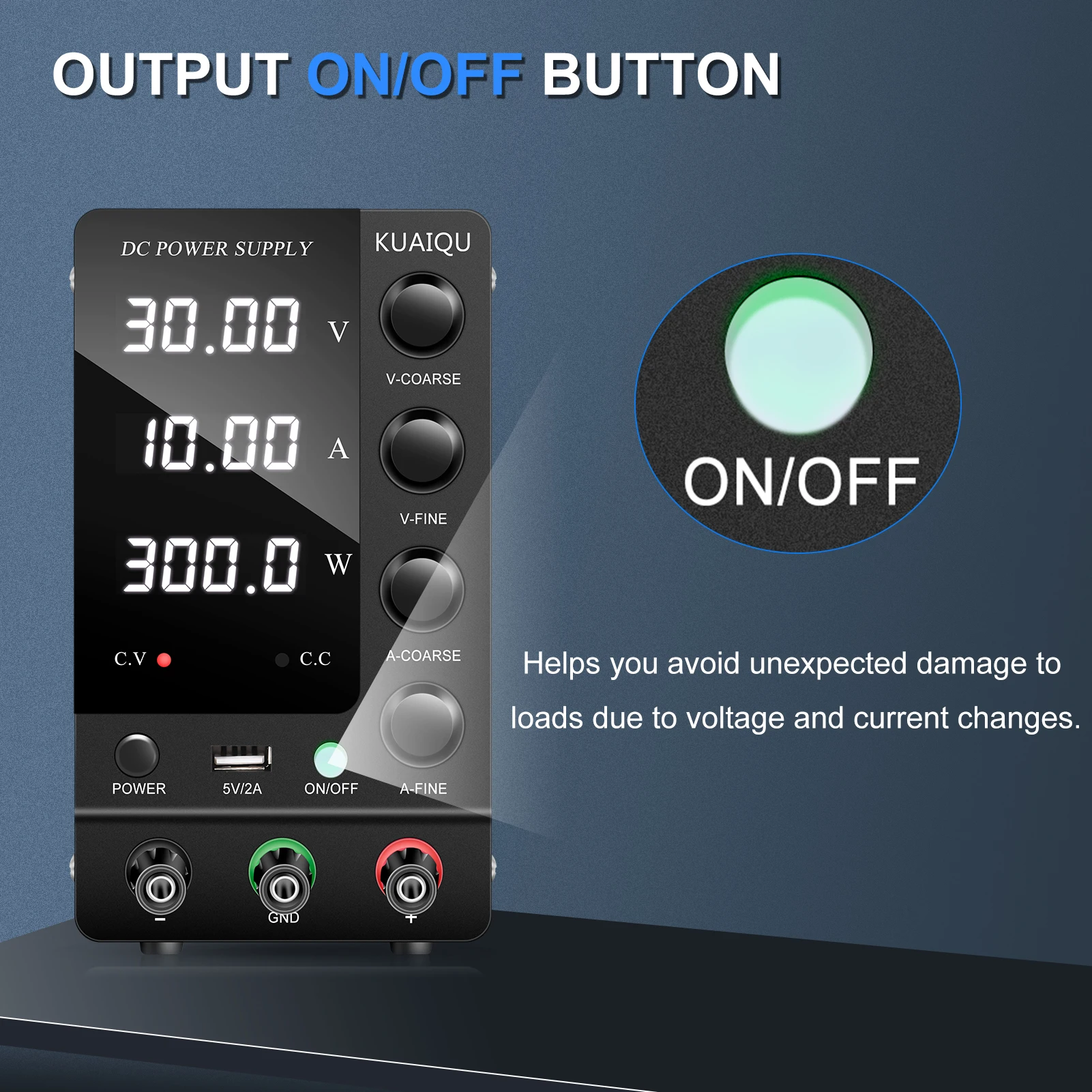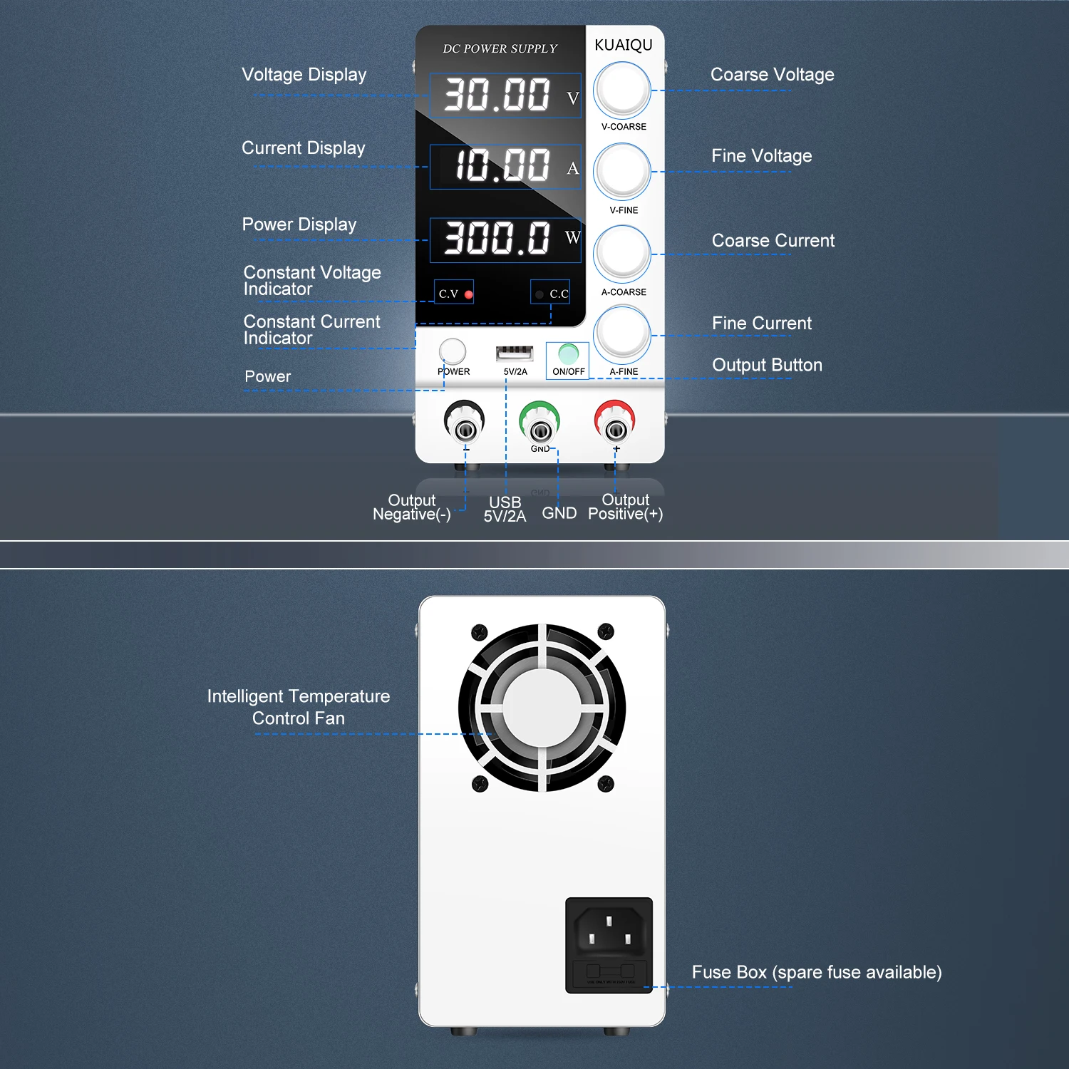 สวิตช์ไฟด้านหน้า ปุ่มปรับหยาบและละเอียดที่แม่นยำ: อัพเกรดจากแหล่งจ่ายไฟสลับแบบเก่า สวิตช์ไฟเวอร์ชันใหม่ล่าสุดอยู่ที่ด้านหน้าของแหล่งจ่ายไฟที่มีการควบคุม DC คุณไม่จำเป็นต้องหมุนไปด้านหลังเพื่อเปิด/ปิด ปิดแหล่งจ่ายไฟควบคุมการสลับที่ปรับได้ ใช้งานง่ายและสะดวกคุณสมบัติแหล่งจ่ายไฟแบบตั้งโต๊ะแบบควบคุม DC แบบสวิตชิ่งที่ปรับได้พร้อมปุ่มปรับแรงดันไฟฟ้า/กระแสไฟหยาบและละเอียดที่แม่นยำ คุณสามารถตั้งค่าแรงดันและกระแสที่ต้องการบนแหล่งจ่ายไฟแบบตั้งโต๊ะ KUAIQU ได้อย่างง่ายดาย