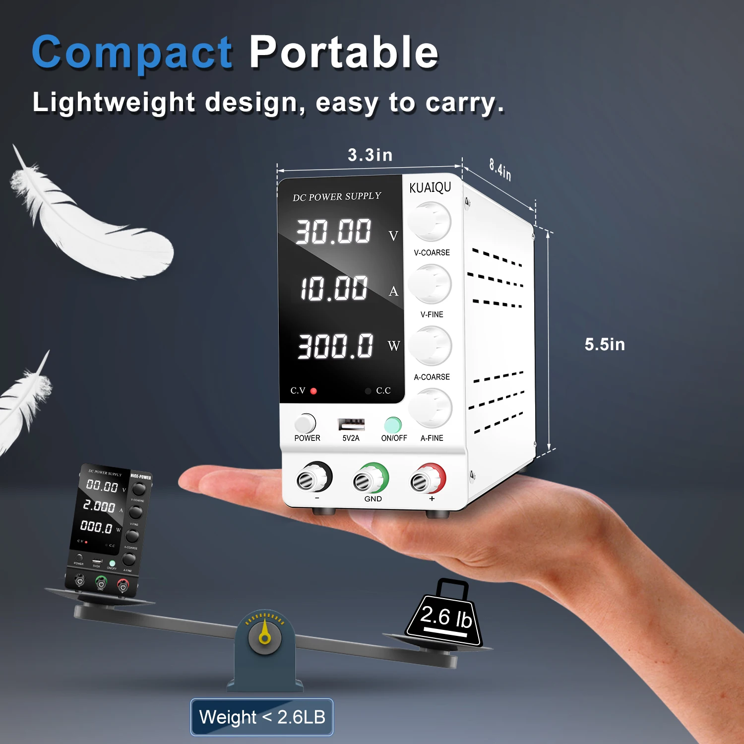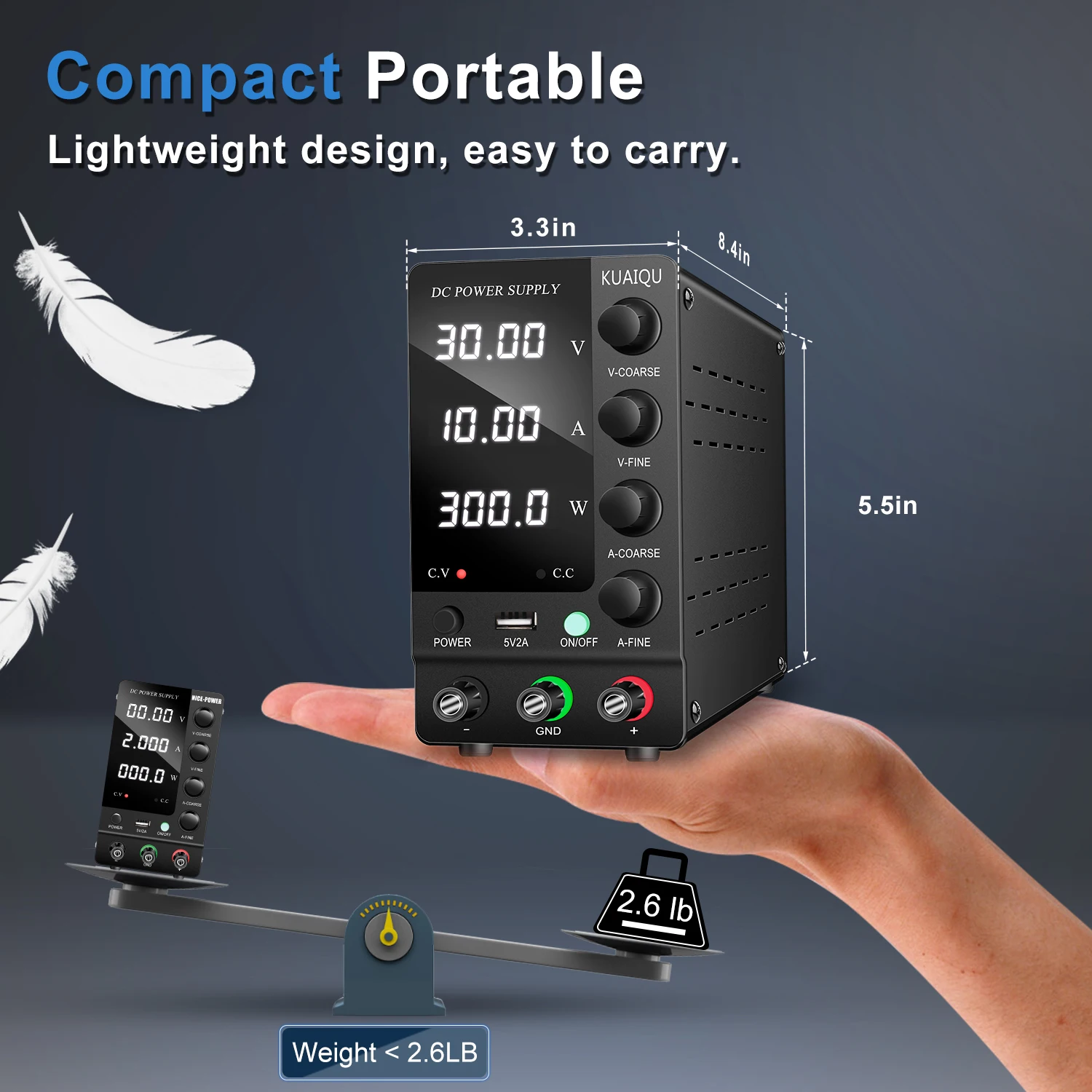 การออกแบบที่กะทัดรัด น้ำหนักเบา และพกพาได้: แหล่งจ่ายไฟที่มีแรงดันไฟฟ้ากระแสตรงคงที่ใช้การออกแบบแนวตั้งที่มั่นคงพร้อมขายางดูดซับแรงกระแทกที่ด้านล่างของแหล่งจ่ายไฟแบบตั้งโต๊ะ ทำให้ปลอดภัยและมีเสถียรภาพมากขึ้นเมื่อใช้งานขนาดของแหล่งจ่ายไฟ DC แบบปรับได้คือ 8.4*3.3*5.5 นิ้ว และแหล่งจ่ายไฟในห้องปฏิบัติการมีน้ำหนักเพียง 2.6 ปอนด์ ซึ่งเบามากและพกพาได้คุณสามารถพกพาอุปกรณ์ตั้งโต๊ะเข้าและออกจากสถานที่ทำงานต่างๆ ได้