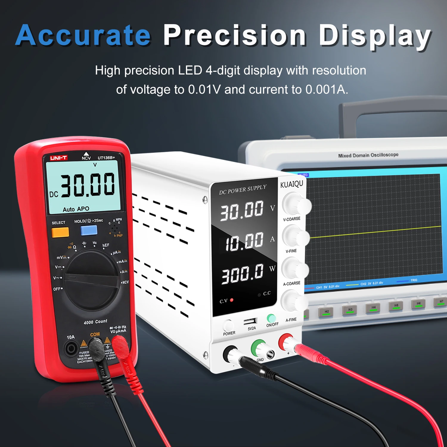 เคล็ดลับที่อบอุ่น: ความแม่นยำสำหรับแหล่งจ่ายไฟแบบตั้งโต๊ะ NICE-POWER: สถานะแรงดันไฟฟ้าคงที่พร้อมความเสถียรของแรงดันไฟฟ้า≤1%+30mV และความเสถียรของโหลด≤1%+30mV สถานะกระแสคงที่พร้อมความเสถียรของกระแส≤1%+30mA และความเสถียรของโหลด≤1%+30mA ความแม่นยำในการแสดงผล: 1% +5 หลักหากต้องการวัดความแม่นยำของแหล่งจ่ายไฟ DC อย่างถูกต้อง โปรดอย่าเชื่อมต่อโหลดใดๆ และตรวจสอบให้แน่ใจว่ามัลติมิเตอร์ได้รับการตั้งค่าอย่างเหมาะสมกับช่วงการวัดแรงดันไฟฟ้า/กระแสไฟฟ้า DCโปรดทราบว่ากฎของโอห์มจะถูกปฏิบัติตามเสมอเมื่อใช้แหล่งจ่ายไฟ DC และสายเคเบิลจะสูญเสียพลังงานซึ่งทำให้ความแม่นยำแตกต่างกันเล็กน้อย