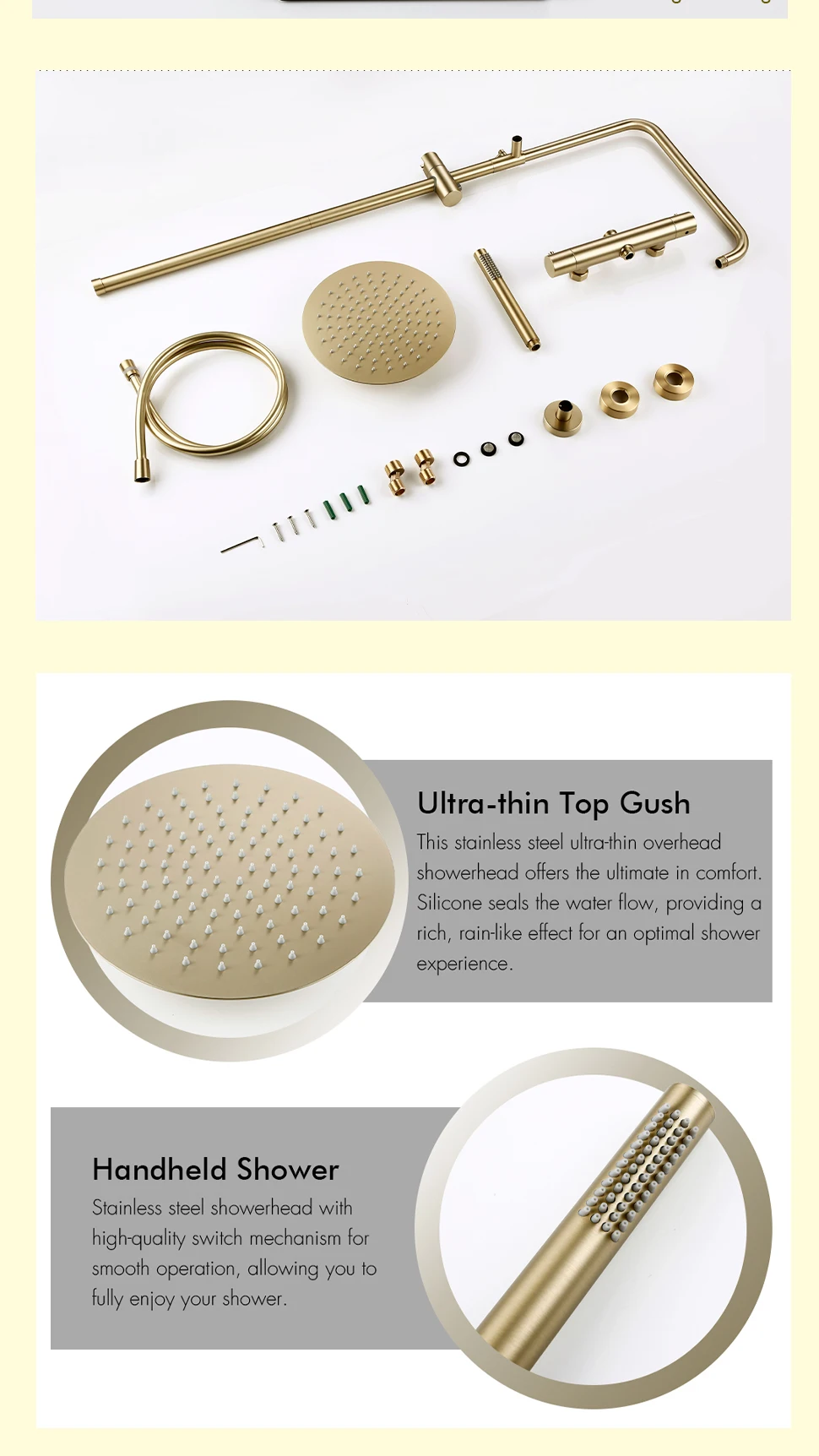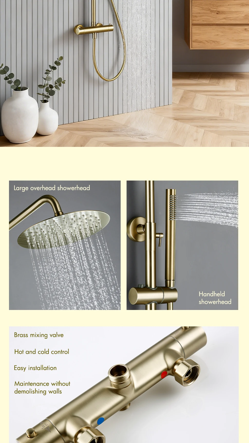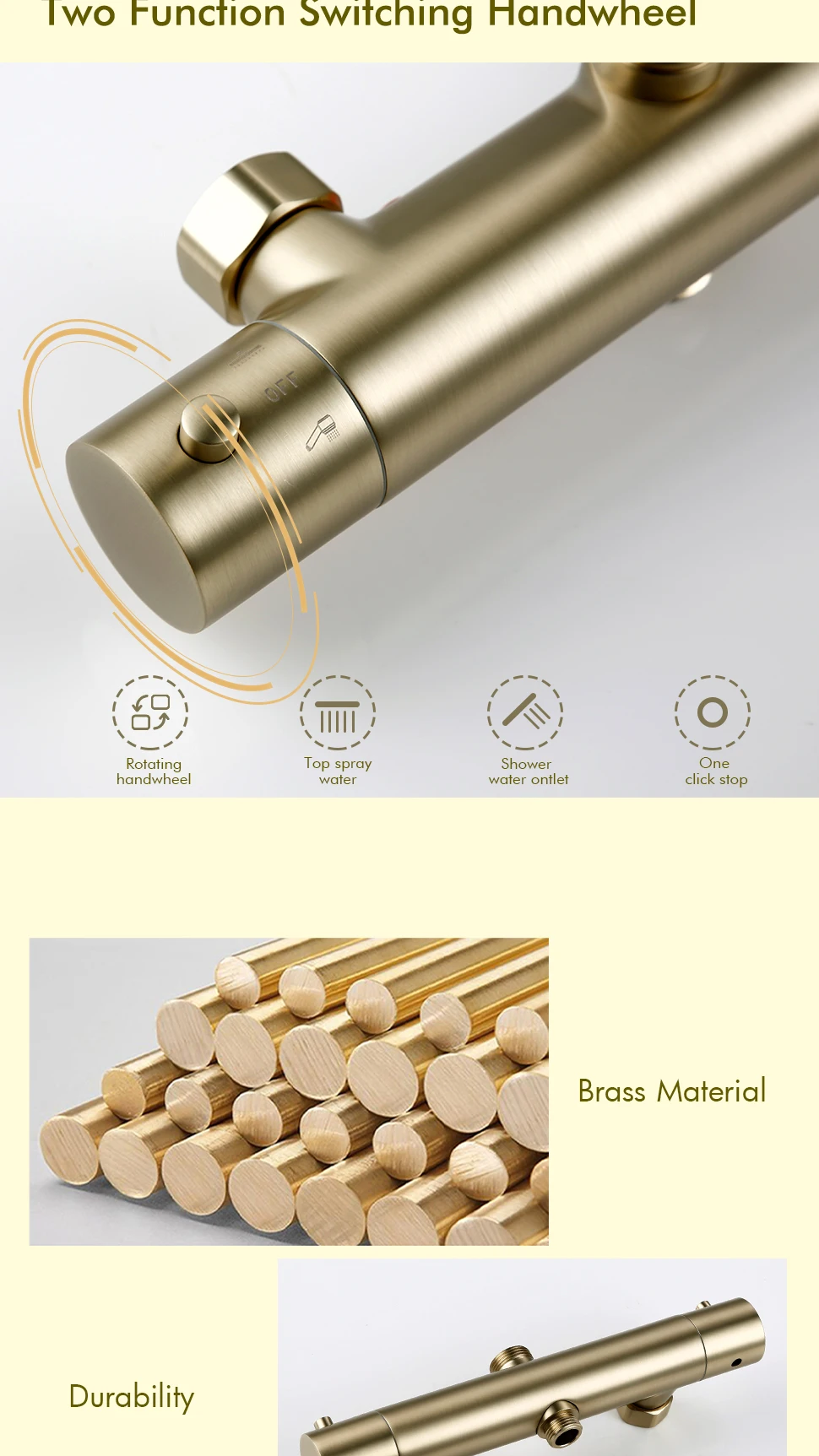 ชุดก๊อกน้ำฝักบัวแบบเทอร์โมสแตติกสีทองขัดเงา ติดผนัง ทำจากทองเหลือง พร้อมฝักบัวแบบเรนชาวเวอร์