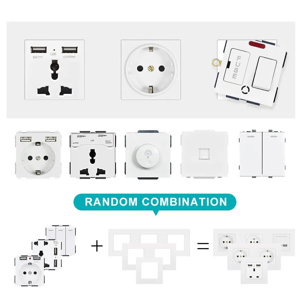 Wallpad DIY โมดูลแผงอะคริลิคสีขาว Gold Border Wall Power Socket ปลั๊กไฟฟ้าฟังก์ชั่น Key พอร์ต USB 110 220V