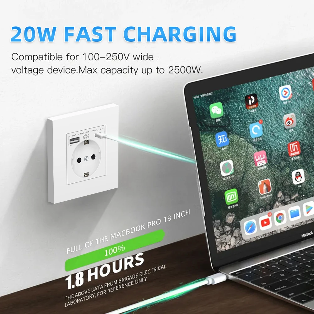 ปลั๊กไฟติดผนัง EU พร้อม usb c 20W ชาร์จเร็ว