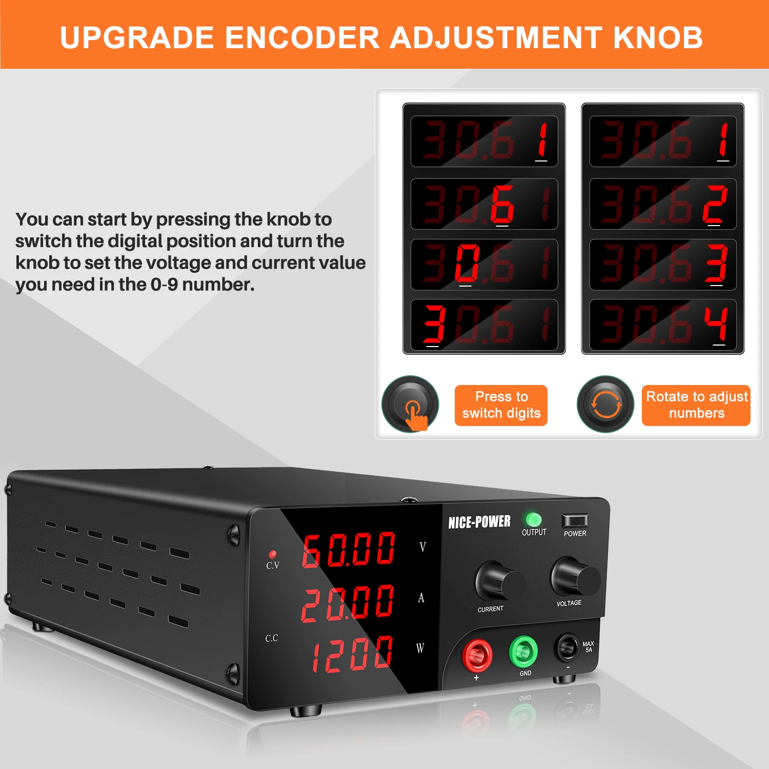 【ปุ่มหมุนตั้งค่าความแม่นยำสูงรุ่นอัปเกรดปี 2023】 เพียงแค่ “ตั้งค่า” แรงดันและกระแสไฟฟ้าแทนการ “ปรับ”สวิตช์ตัวเข้ารหัสจะแทนที่สวิตช์โพเทนชิออมิเตอร์ โดยจะเปลี่ยนตัวเลขโดยการกดปุ่มหมุน และแต่ละหลักสามารถตั้งค่าได้ในช่วง 0-9 โดยการหมุนปุ่มหมุนทำให้งานง่ายและมีประสิทธิภาพยิ่งขึ้น!