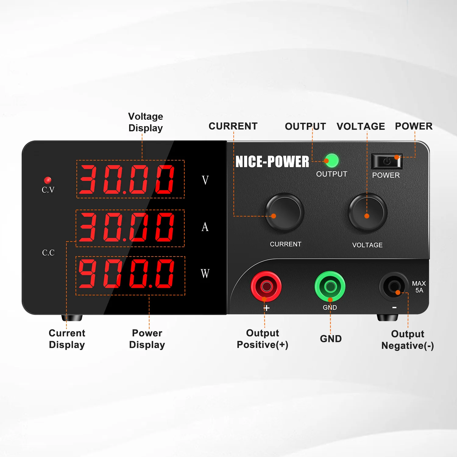 【จอแสดงผล LED 4 หลัก, แสดงสถานะพลังงาน】แหล่งจ่ายไฟ DC เป็นอุปกรณ์ปรับสภาพพลังงานระดับมืออาชีพที่มีความละเอียดสูงถึง 0.01V และ 0.001Aจอแสดงผล LED แบบ 4 หลักพร้อมไฟพื้นหลังของแหล่งจ่ายไฟแบบตั้งโต๊ะแสดงค่าความต่างศักย์ กระแสไฟ และกำลังไฟได้อย่างแม่นยำยิ่งขึ้น และสามารถมองเห็นได้ง่ายแม้ในสภาพแสงน้อย