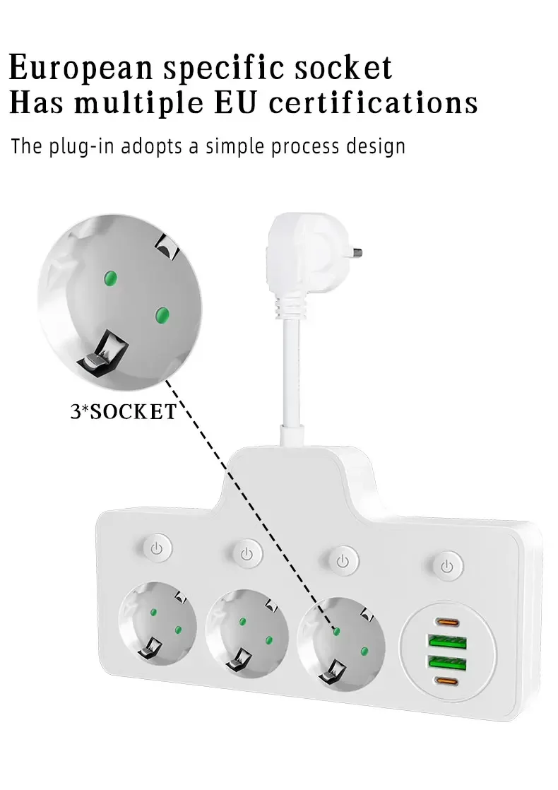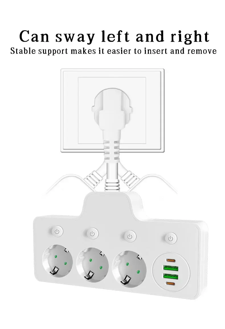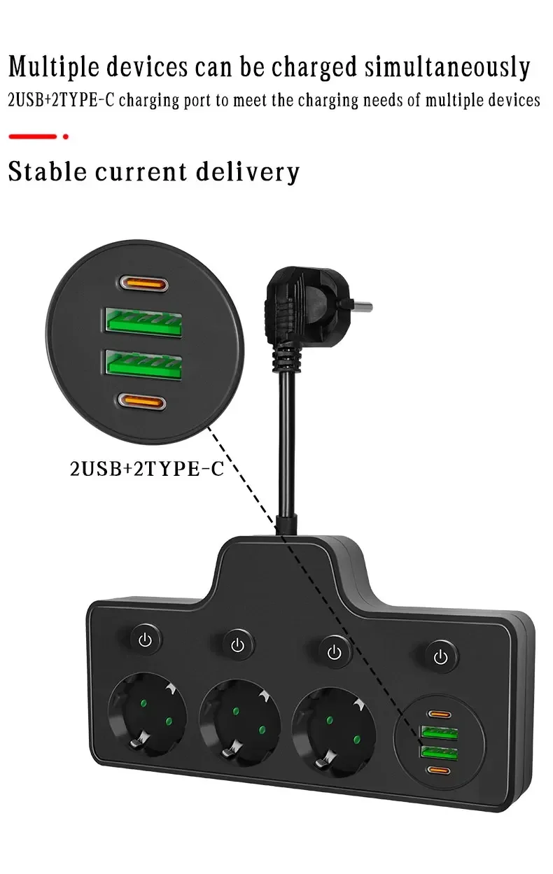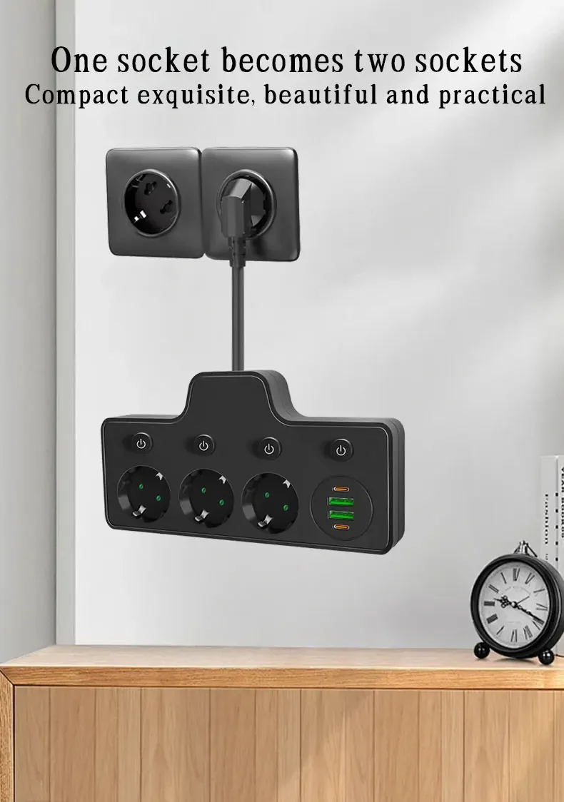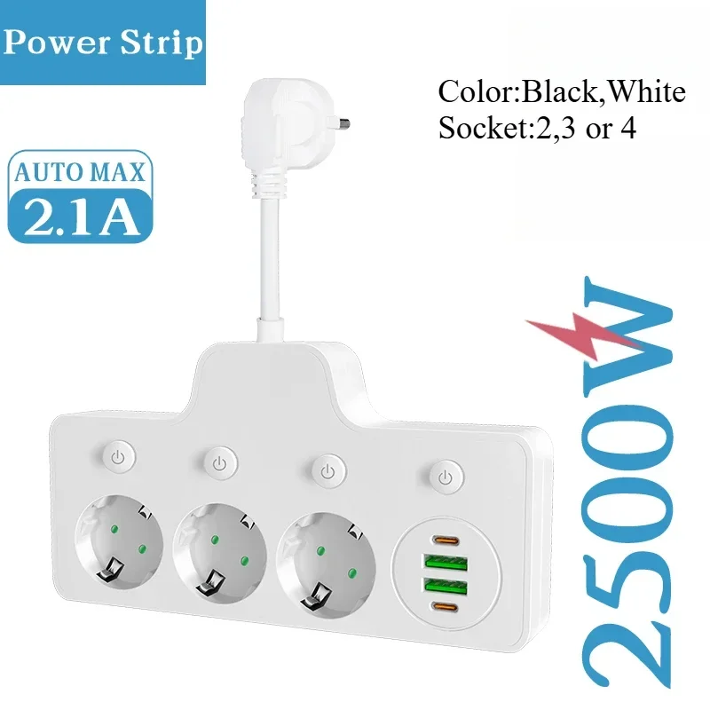 ปลั๊กพ่วงนี้มาพร้อมกับปลั๊กไฟ 2-3-4 และพอร์ต USB 2.1A ให้การเชื่อมต่อที่หลากหลายสําหรับใช้ในบ้านและสํานักงาน