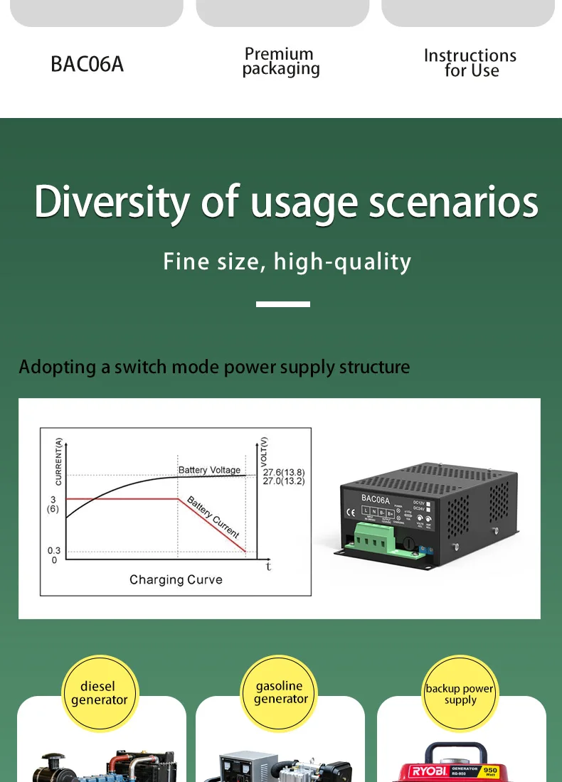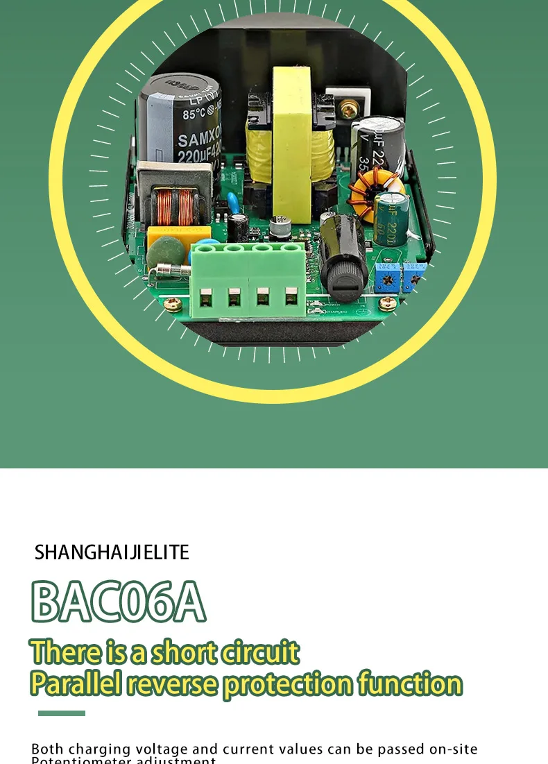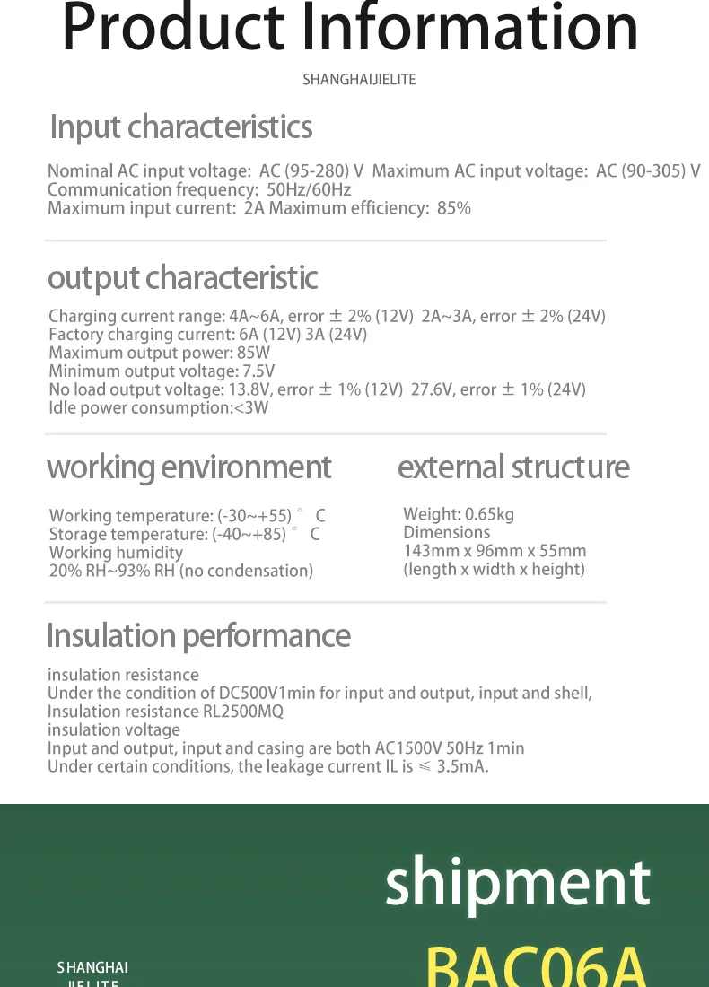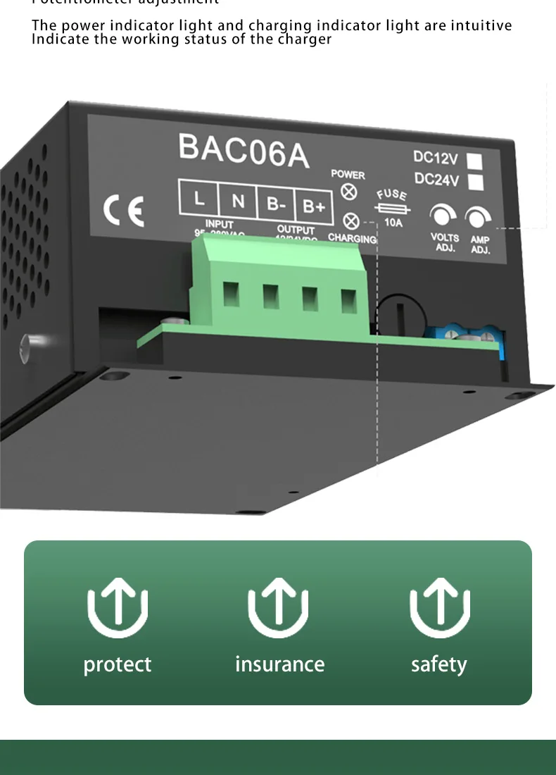 เครื่องชาร์จแบตเตอรี่แบบสวิตช์ BAC06A ใช้ส่วนประกอบแหล่งจ่ายไฟแบบสวิตชิ่งล่าสุดและออกแบบมาเพื่อชาร์จแบตเตอรี่ตะกั่ว-กรดตามลักษณะเฉพาะ เครื่องชาร์จเหมาะสำหรับการชาร์จแบตเตอรี่ตะกั่วกรดแบบลอย 6A กระแสไฟในการชาร์จสูงสุดของที่ชาร์จ12V ที่ชาร์จ24V มีกระแสชาร์จสูงสุดที่3A