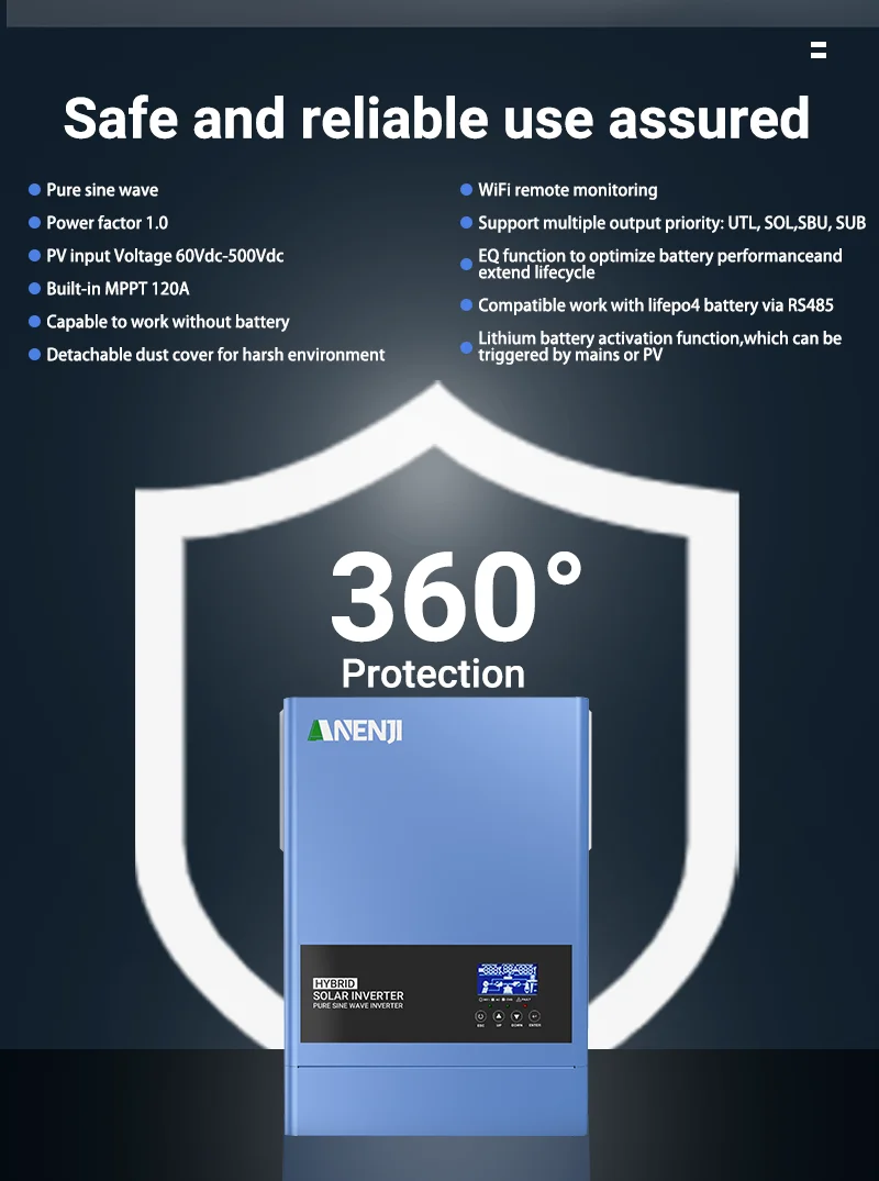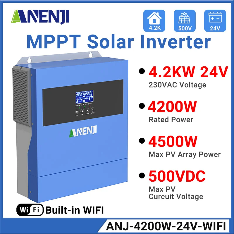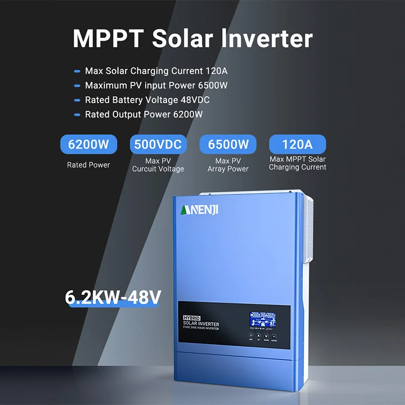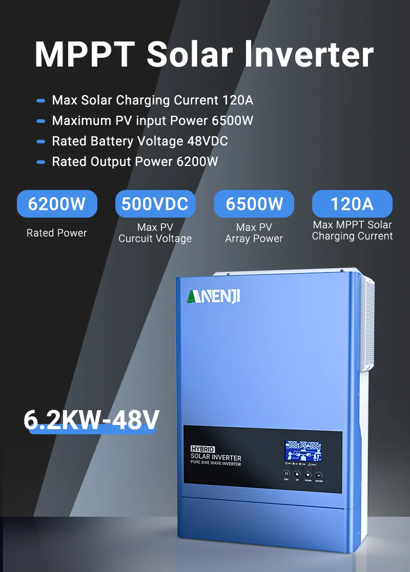 ANENJI 6.2KW 4.2KW โซลาร์อินเวอร์เตอร์ไฮบริด 48V 24V คลื่นไซน์บริสุทธิ์ On Grid Off Grid MPPT 120A 100A PV 500VDC คอนโทรลเลอร์ชาร์จพลังงานแสงอาทิตย์