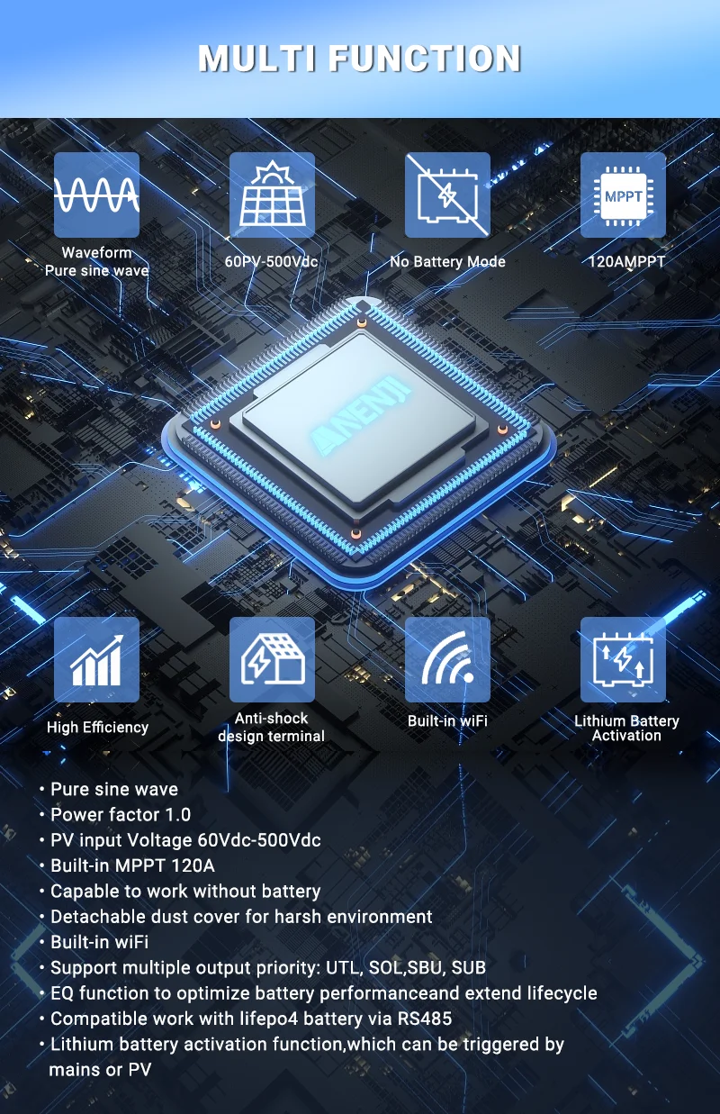 ความสามารถในการทำงานของอินเวอร์เตอร์ในช่วงแรงดันไฟฟ้า MPPT ขั้นสูงที่ 60-500VDC รับประกันการสกัดพลังงานสูงสุดจากแผงโซลาร์เซลล์ ซึ่งช่วยเพิ่มประสิทธิภาพการใช้พลังงานให้สูงขึ้นนอกจากนี้ยังมีกระแสไฟชาร์จพลังงานแสงอาทิตย์สูงสุด 120A ทำให้มั่นใจได้ว่าแบตเตอรี่จะชาร์จได้รวดเร็วและมีประสิทธิภาพความสามารถของอุปกรณ์อัจฉริยะของอินเวอร์เตอร์และการรวมโมดูล WiFi ช่วยให้สามารถตรวจสอบและควบคุมระยะไกล เพิ่มความสะดวกสบายของผู้ใช้และการจัดการระบบ