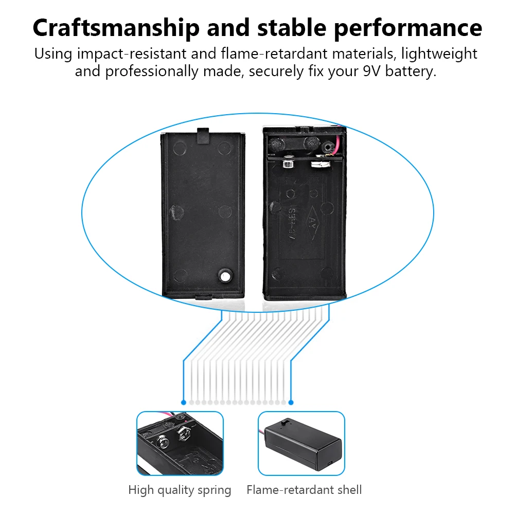 สะดวกในการติดตั้งและเปลี่ยนแบตเตอรี่ เลื่อนฝาครอบเพื่อเปิดและปิดแอปพลิเคชั่น: คลิปแบตเตอรี่9โวลต์ใช้กันอย่างแพร่หลายในแอปพลิเคชันอิเล็กทรอนิกส์และโปรเจกต์งานอดิเรกขนาดเล็กแบบทำมือ คุณสามารถเชื่อมต่อหลายผู้ถือและแบตเตอรี่ในแบบคู่ขนานเพื่อสร้างระบบจ่ายไฟใหม่