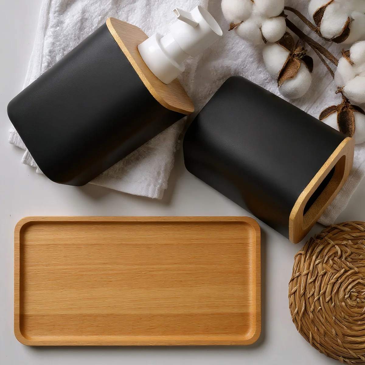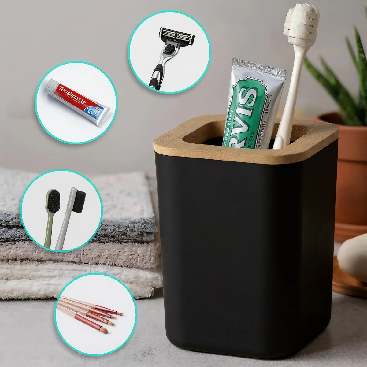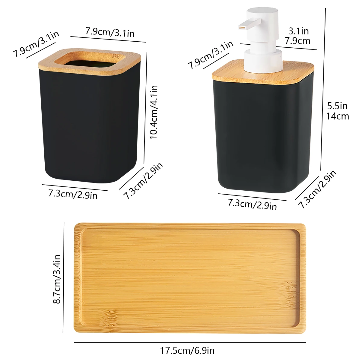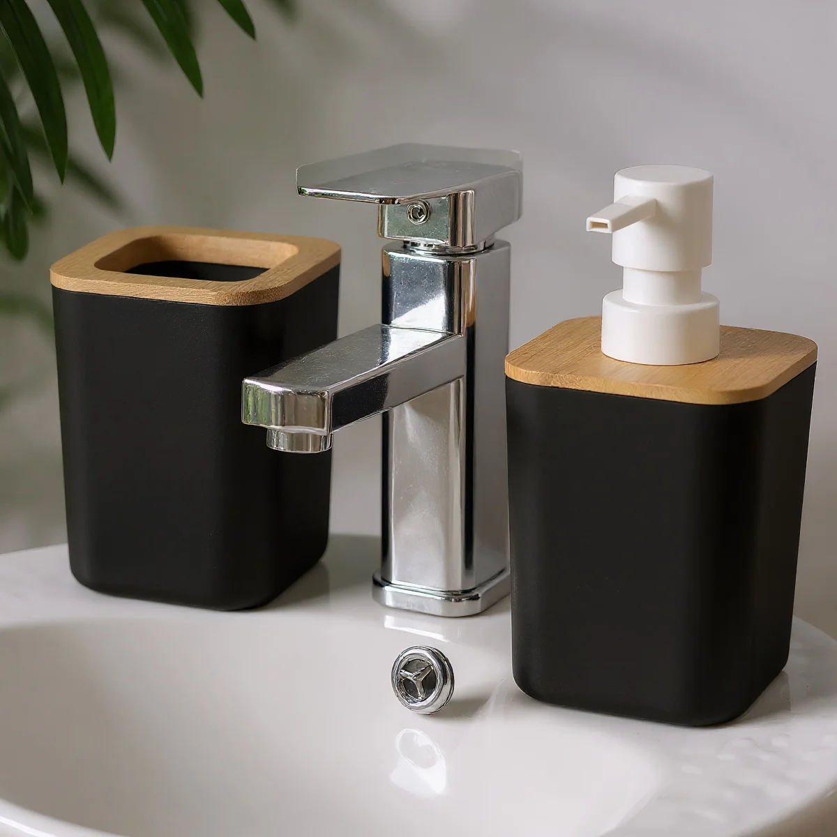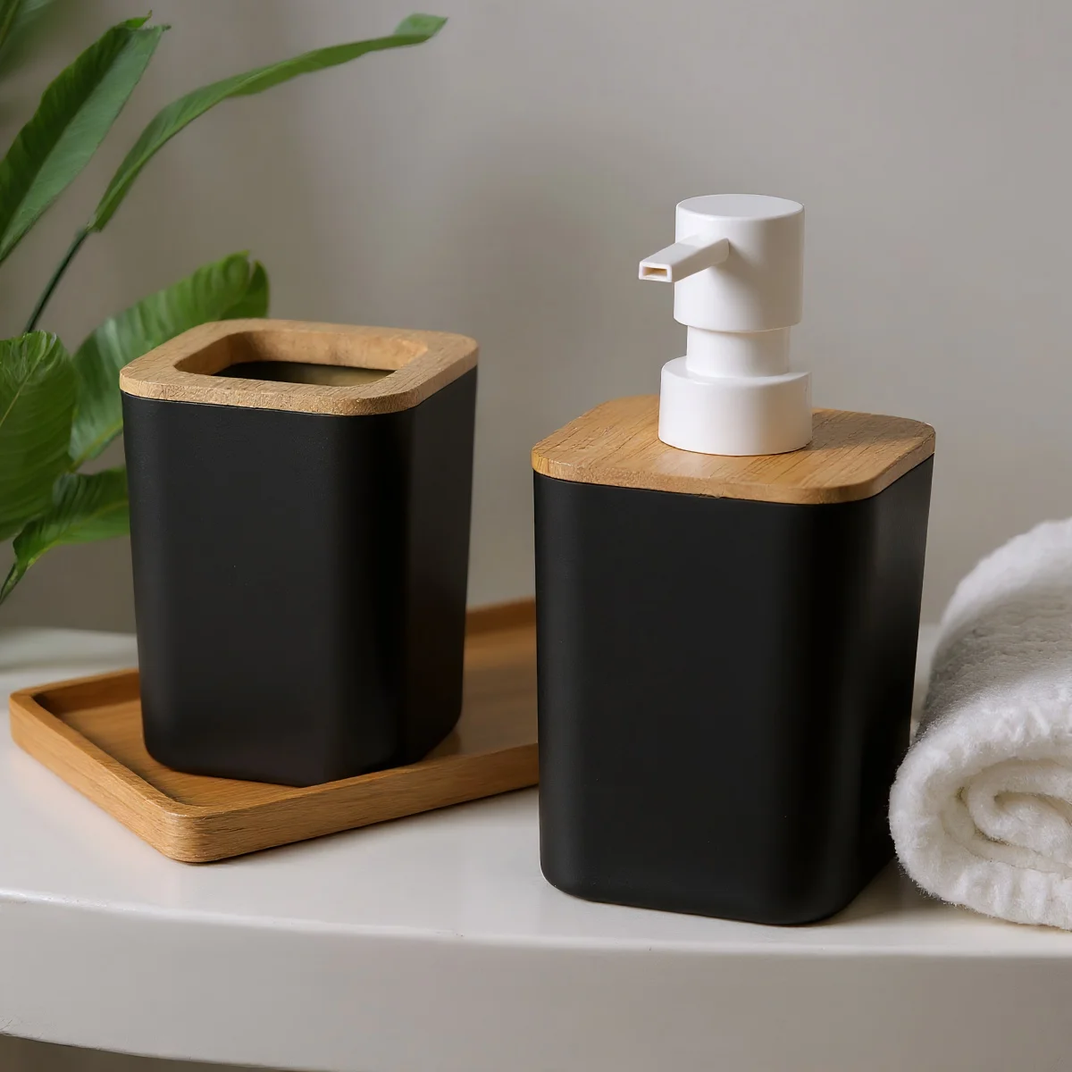 ชุดอุปกรณ์ห้องน้ำสีดำ ขวดสบู่เหลวพร้อมถ้วยเก็บของสำหรับแปรงสีฟัน ยาสีฟัน ที่วางมีดโกน ตกแต่งเคาน์เตอร์อย่างมีสไตล์