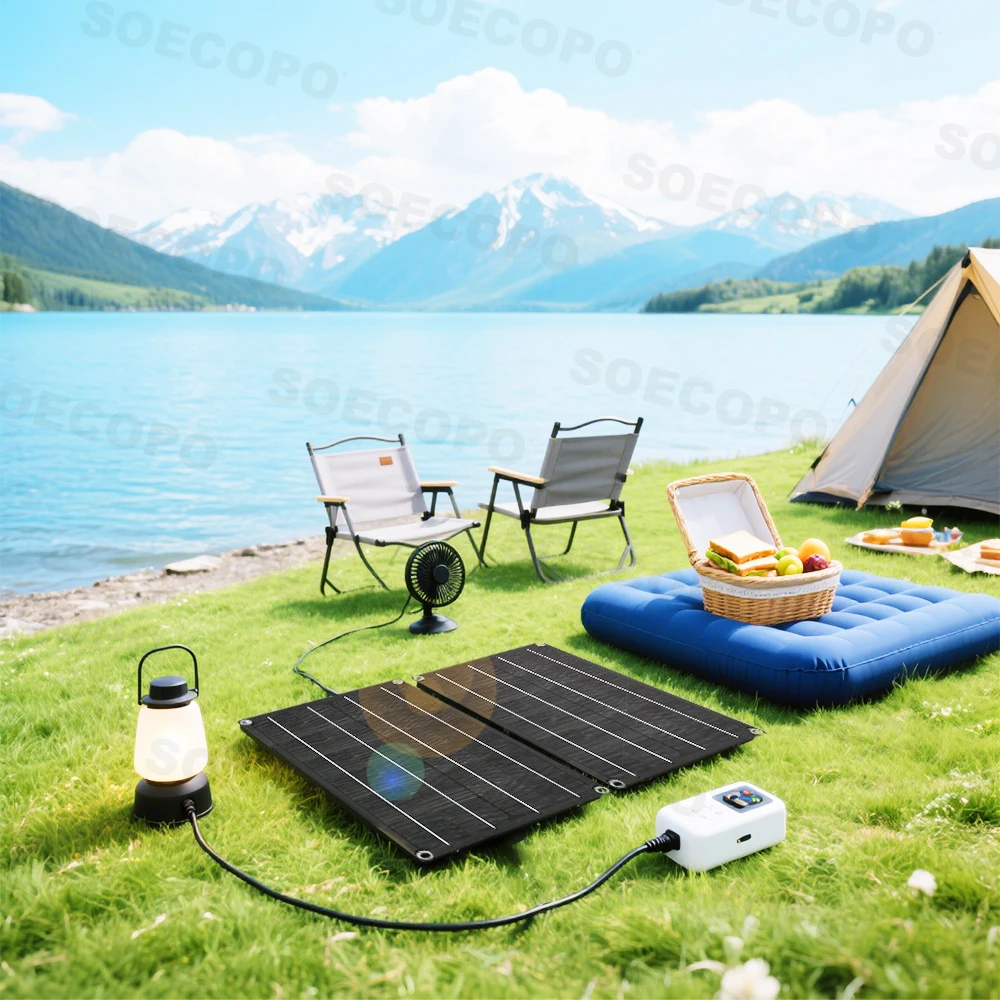 ชุดแผงโซลาร์เซลล์ SOECOPO 400W แบบพับได้ 2 แผง 18V สำหรับตั้งแคมป์ มาพร้อมคอนโทรลเลอร์ 100A ฟรี และพอร์ต USB 5V เพื่อการชาร์จที่ง่ายดาย