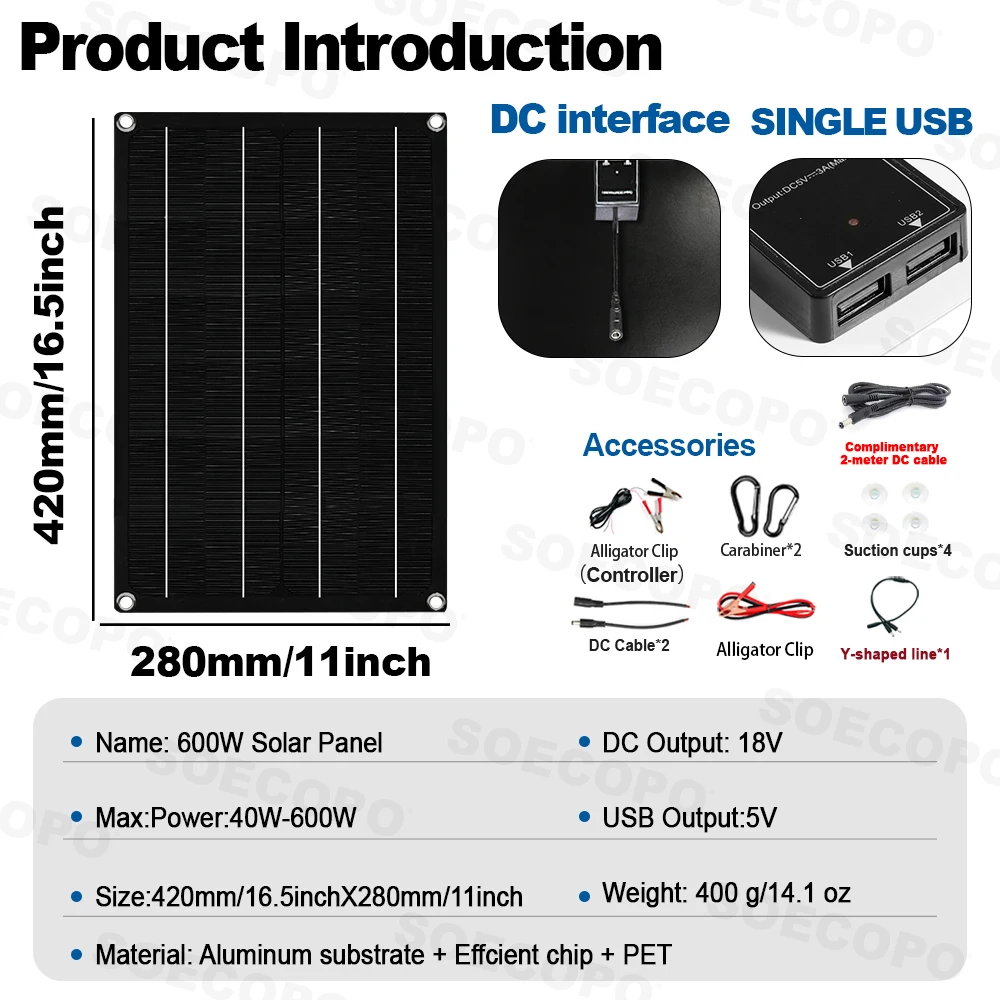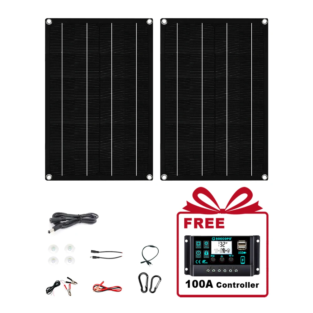 ชุดแผงโซลาร์เซลล์ SOECOPO 1200W แบบพกพา 2 แผง 12V – 18V แผงเซลล์แสงอาทิตย์ แถมฟรีคอนโทรลเลอร์ 100A ช่อง USB 5V สำหรับชาร์จอุปกรณ์ตั้งแคมป์