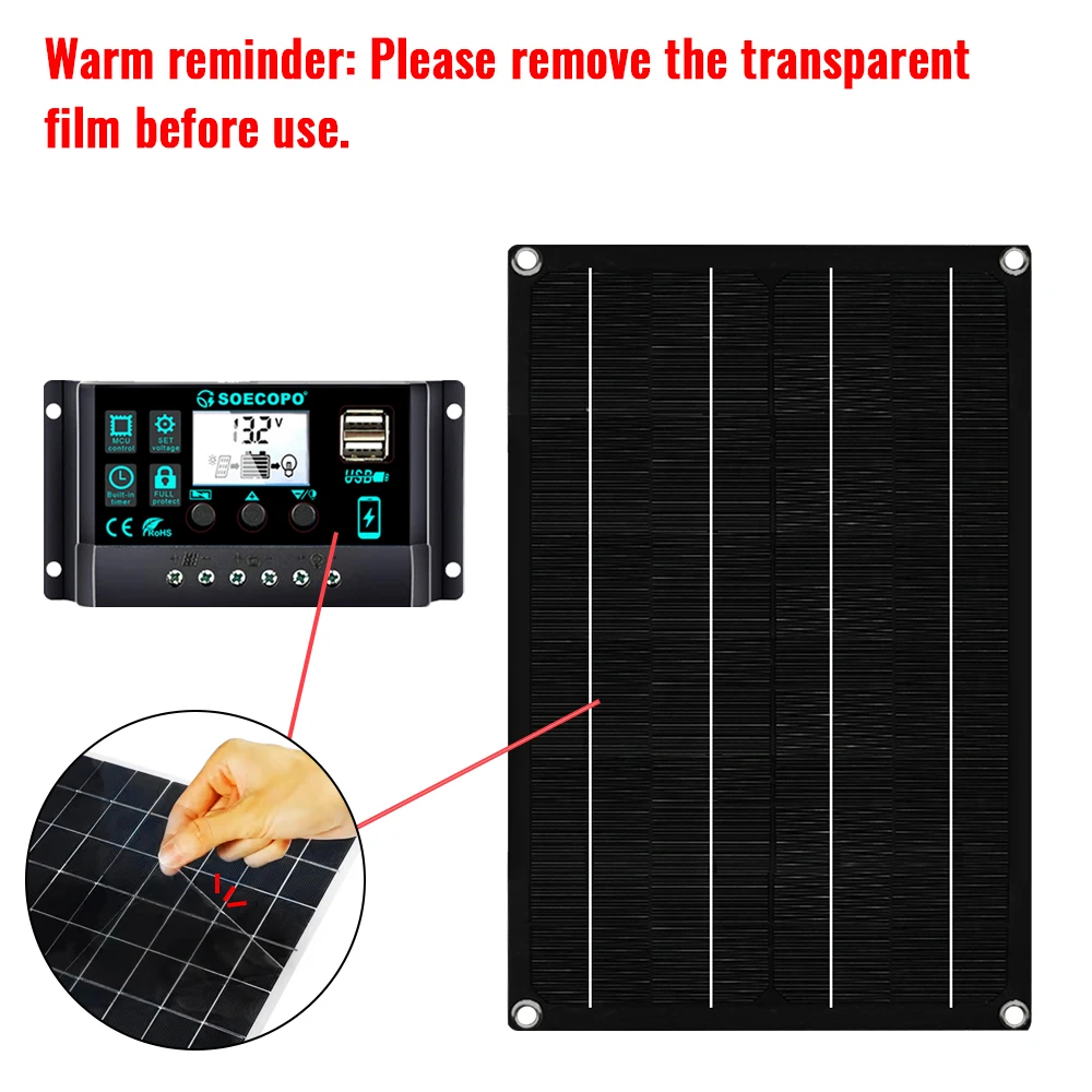 โปรดลอกฟิล์มใสบนแผงโซลาร์เซลล์ออกก่อนใช้งานเพื่อให้แน่ใจว่าสามารถผลิตพลังงานได้ตามปกติ