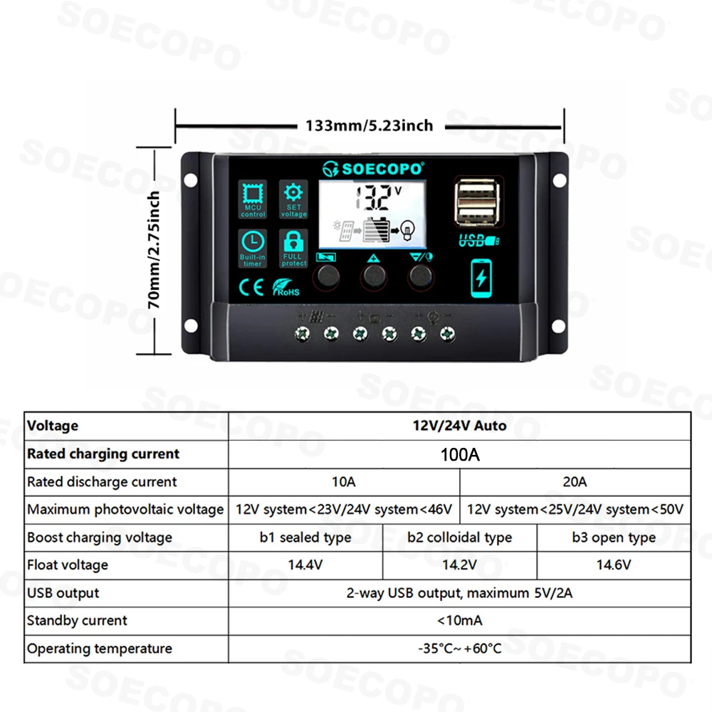 🔹 Function: Equipped with automatic recognition function for 12V/24V, rated charging current of 100A, rated discharging current of 10A (12V system), 20A (24V system), and multiple charging mode settings.