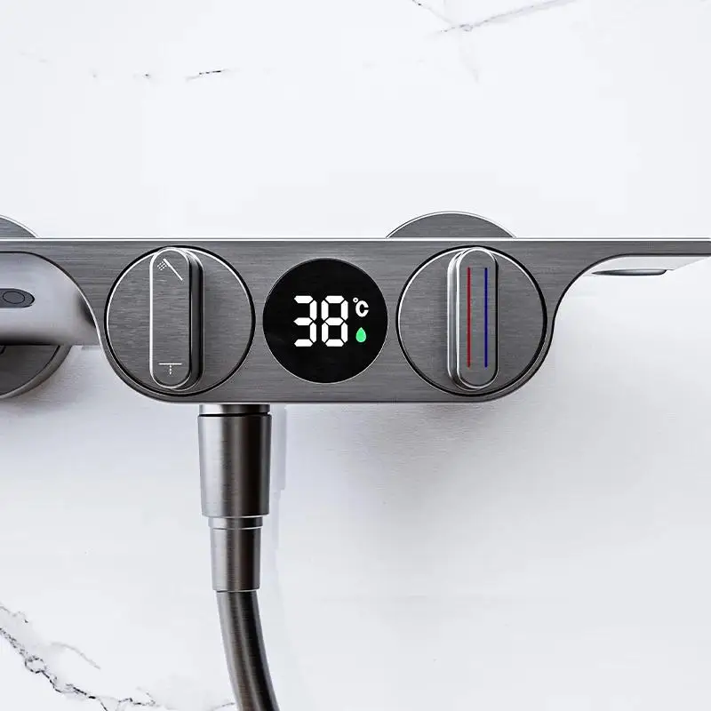สีเทาห้องน้ําอ่างอาบน้ําก๊อกน้ําชุดติดผนังทองเหลืองดิจิตอลจอแสดงผลสมาร์ทน้ําตกชุดก๊อกน้ําสีขาว Chrome สีดํา