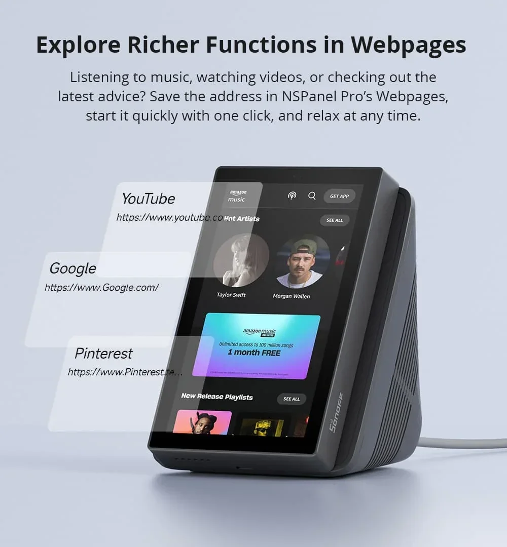 ฟังเพลง ดูวิดีโอ หรืออ่านคำแนะนำล่าสุด?บันทึกที่อยู่ในหน้าเว็บของ NSPanel Pro เริ่มต้นได้อย่างรวดเร็วเพียงคลิกเดียว และผ่อนคลายได้ทุกเวลา