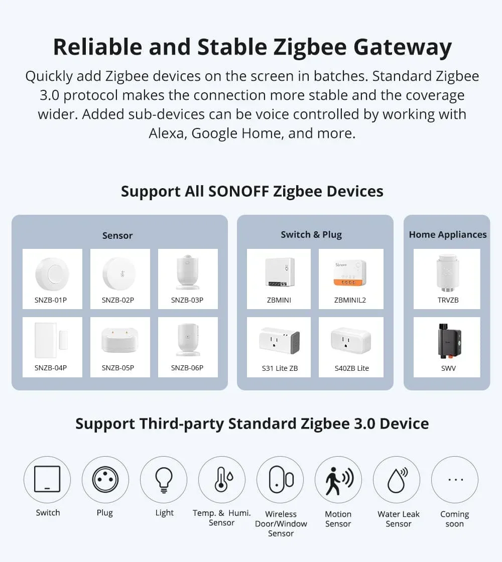 เพิ่มอุปกรณ์ Zigbee บนหน้าจอเป็นกลุ่มได้อย่างรวดเร็วโปรโตคอล Zigbee 3.0 มาตรฐานช่วยให้มั่นใจได้ถึงการเชื่อมต่อที่เสถียรและครอบคลุมพื้นที่กว้างอุปกรณ์ย่อยที่ผสานรวมสามารถควบคุมด้วยเสียงผ่าน Alexa, Google Home และอื่นๆ
