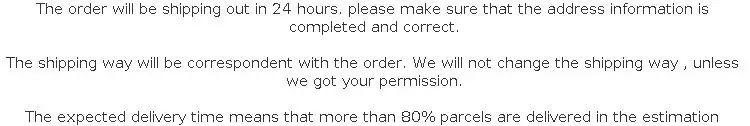 วิธีการจัดส่งสินค้าจะผู้สื่อข่าวกับการสั่งซื้อ เราจะไม่เปลี่ยนวิธีการจัดส่งเว้นแต่เราจะได้รับอนุญาตจากคุณ ระยะเวลาการจัดส่งที่คาดไว้หมายความว่าพัสดุมากกว่า80% ชิ้นจะถูกจัดส่งในระยะเวลาโดยประมาณแต่บางชิ้นก็ยาวกว่าระยะเวลาการจัดส่งที่คาดไว้ กรุณารออีกหนึ่งสัปดาห์ในสถานการณ์เช่นนี้ หากพัสดุยังไม่ได้จัดส่งโปรดติดต่อเรา ความพึงพอใจของคุณเป็นสิ่งสำคัญมากสำหรับเรา โปรดติดต่อเราได้ตลอดเวลาก่อนข้อพิพาท เราจะพยายามอย่างเต็มที่เพื่อให้บริการลูกค้าของเรา |