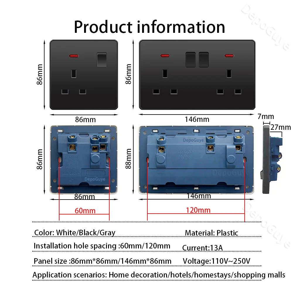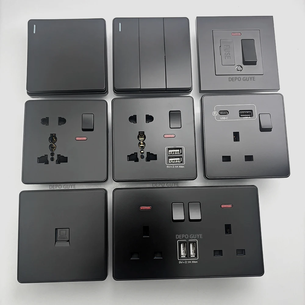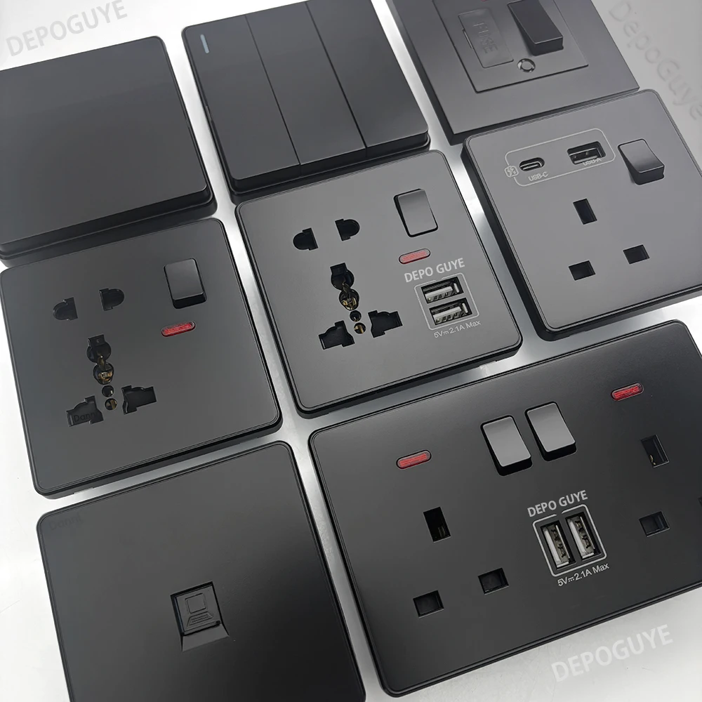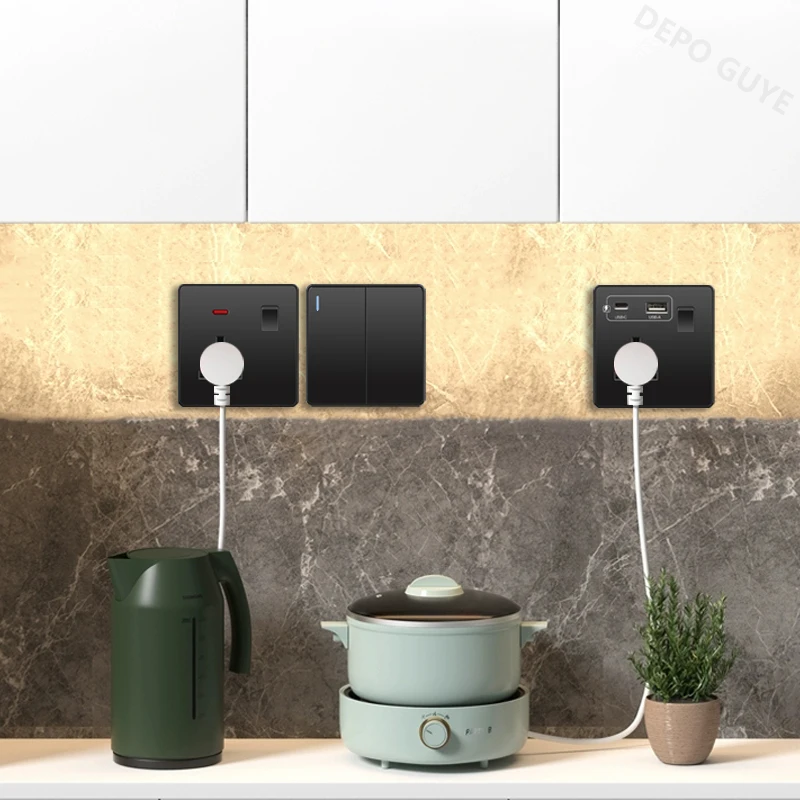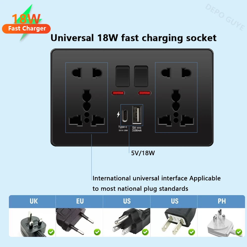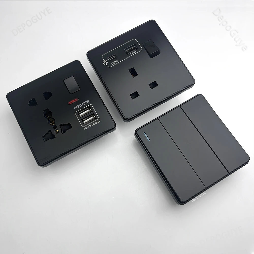 Universal 18W Fast Type C 220V ปลั๊กปลั๊ก,UK สีดํา 13A ซ็อกเก็ตสวิทช์, ไฟฟ้าผนังซ็อกเก็ตแผง USB Charger
