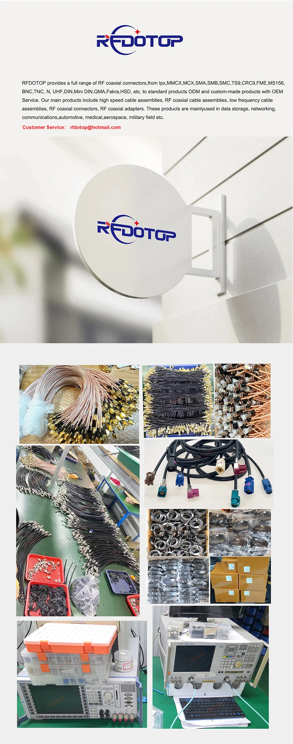 RFDOTOP มีตัวเชื่อมต่อโคแอกเซียล RF ครบวงจรตั้งแต่ SMA, SMB, SMC, TS9, CRC9, FME, MS156, BNC, TNC, N, UHF, Mini DIN, L29 DIN, MQA, Fakra, HSD, LVDS ฯลฯ ไปจนถึงผลิตภัณฑ์มาตรฐาน ODM และผลิตภัณฑ์สั่งทำพิเศษพร้อมบริการ OEMผลิตภัณฑ์หลักของเราประกอบด้วยชุดสายเคเบิลความเร็วสูง ชุดสายเคเบิลโคแอกเซียล RF ชุดสายเคเบิลความถี่ต่ำ ตัวเชื่อมต่อโคแอกเซียล RF อะแดปเตอร์โคแอกเซียล RFผลิตภัณฑ์เหล่านี้ส่วนใหญ่ใช้ในการจัดเก็บข้อมูล เครือข่าย การสื่อสาร ยานยนต์ การแพทย์ การบินและอวกาศ และสาขาอื่นๆ เป็นต้น