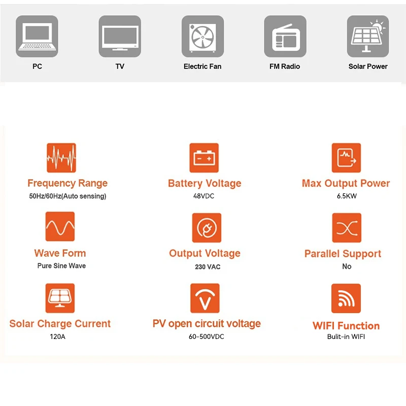 ECGSOLAX 5KW 6.5KW HYBRID SOLAR INVERTER 24V 48V 220Vac พร้อม MPPT 120A 160A Solar Charger PURE Sine WAVE อินเวอร์เตอร์ WIFI ในตัว