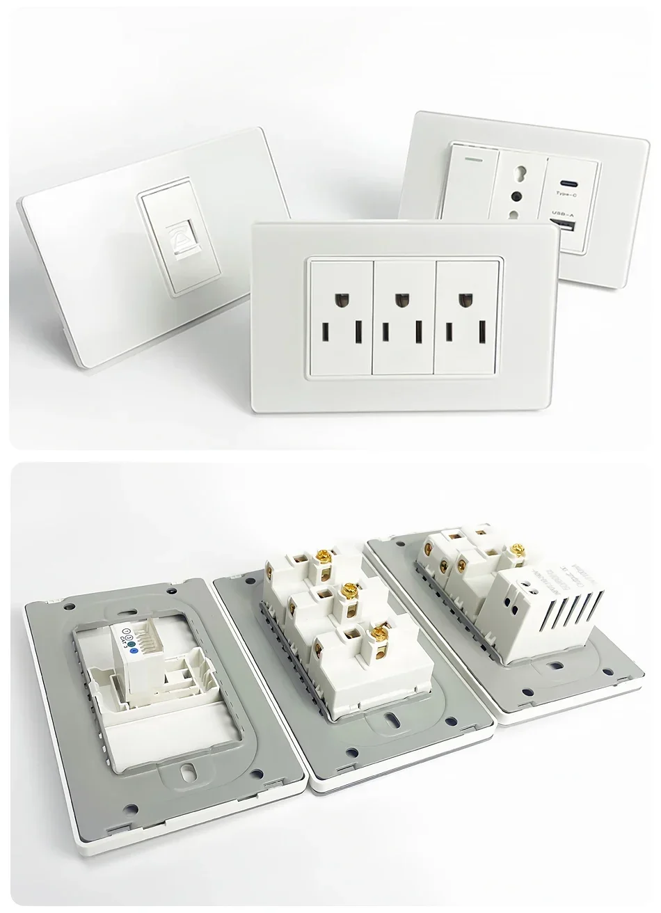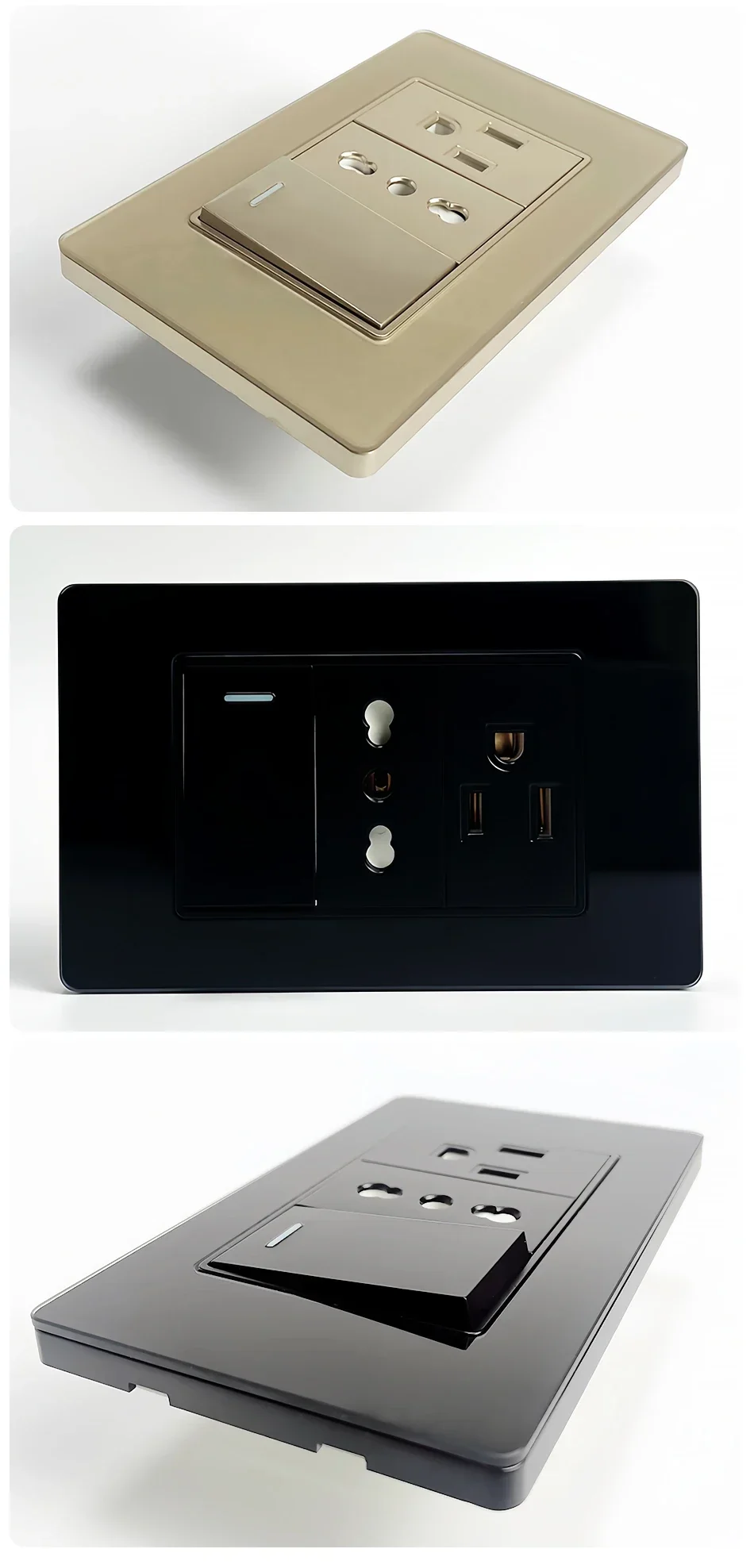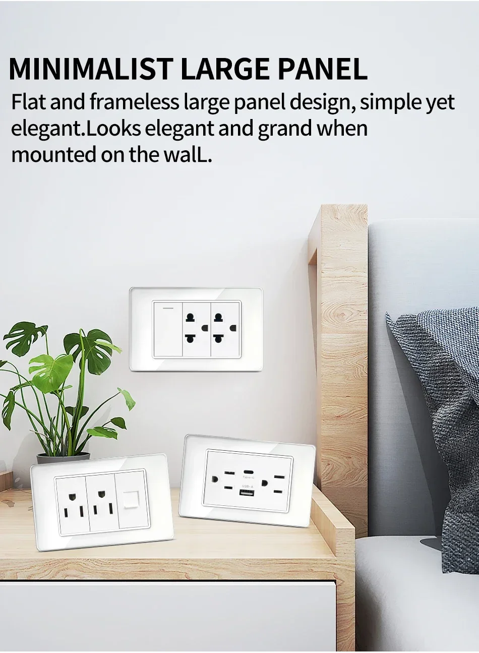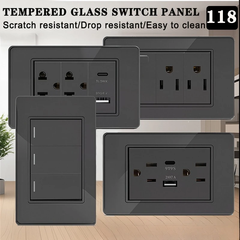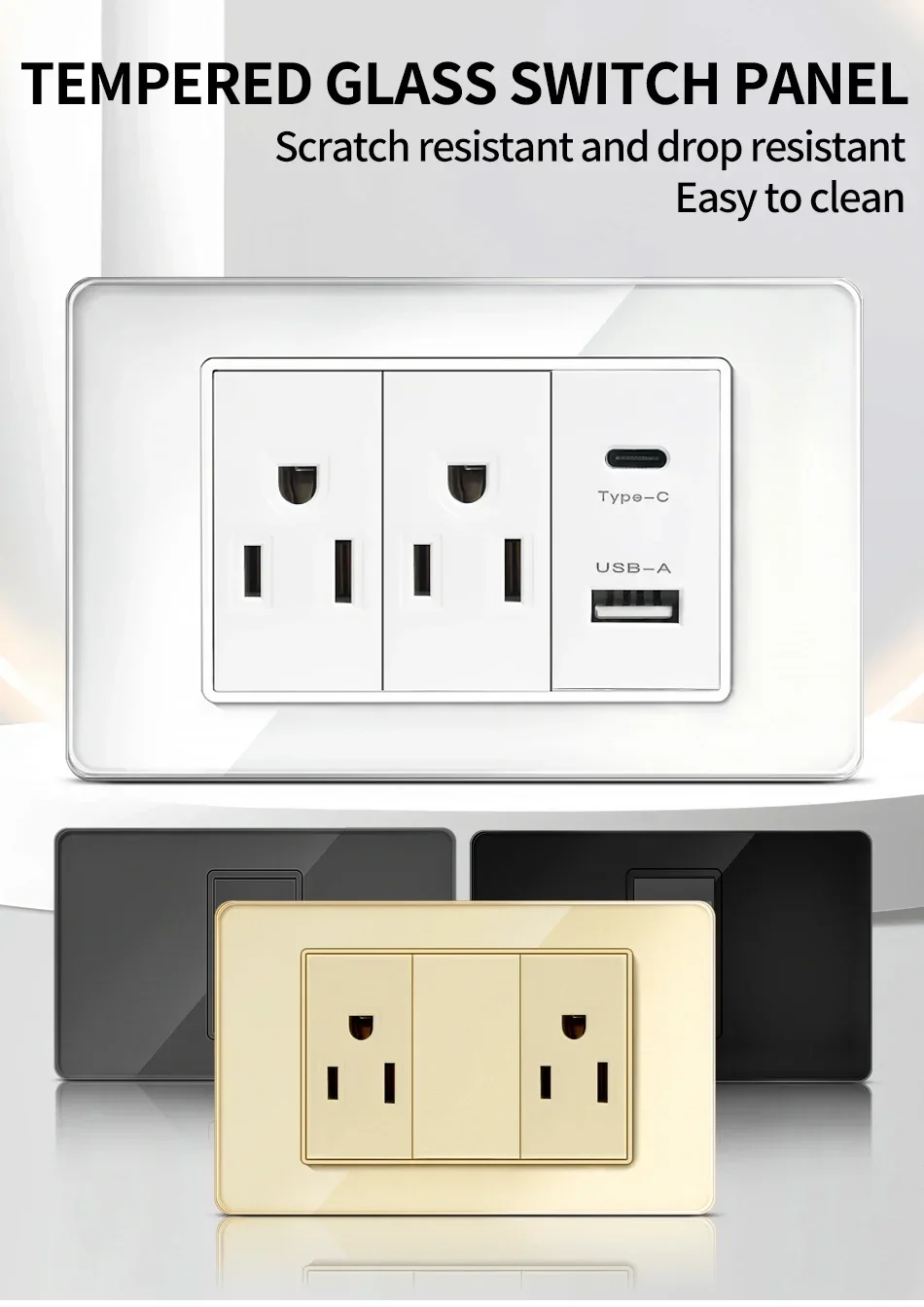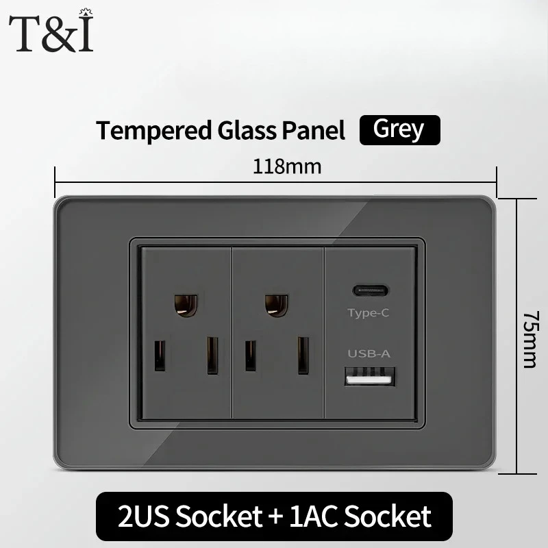 T&I US Standard 118 เต้ารับติดผนังพร้อมสวิตช์ แผงกระจกนิรภัย พอร์ตชาร์จ USB และ Type-C