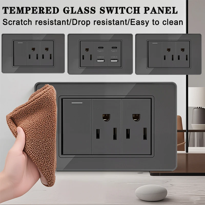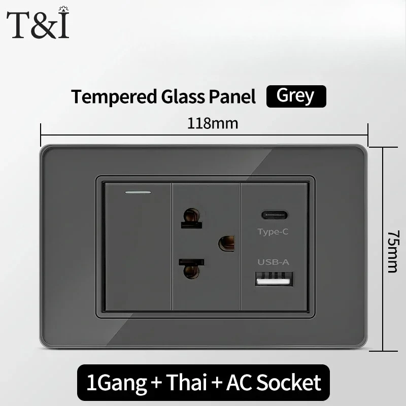 118*75 มม.กระจกนิรภัยซ็อกเก็ต US Wall SOCKET สีเทาไทย USB ปลั๊ก Dual USB Type-C พอร์ต, สวิทช์ไฟ 110V