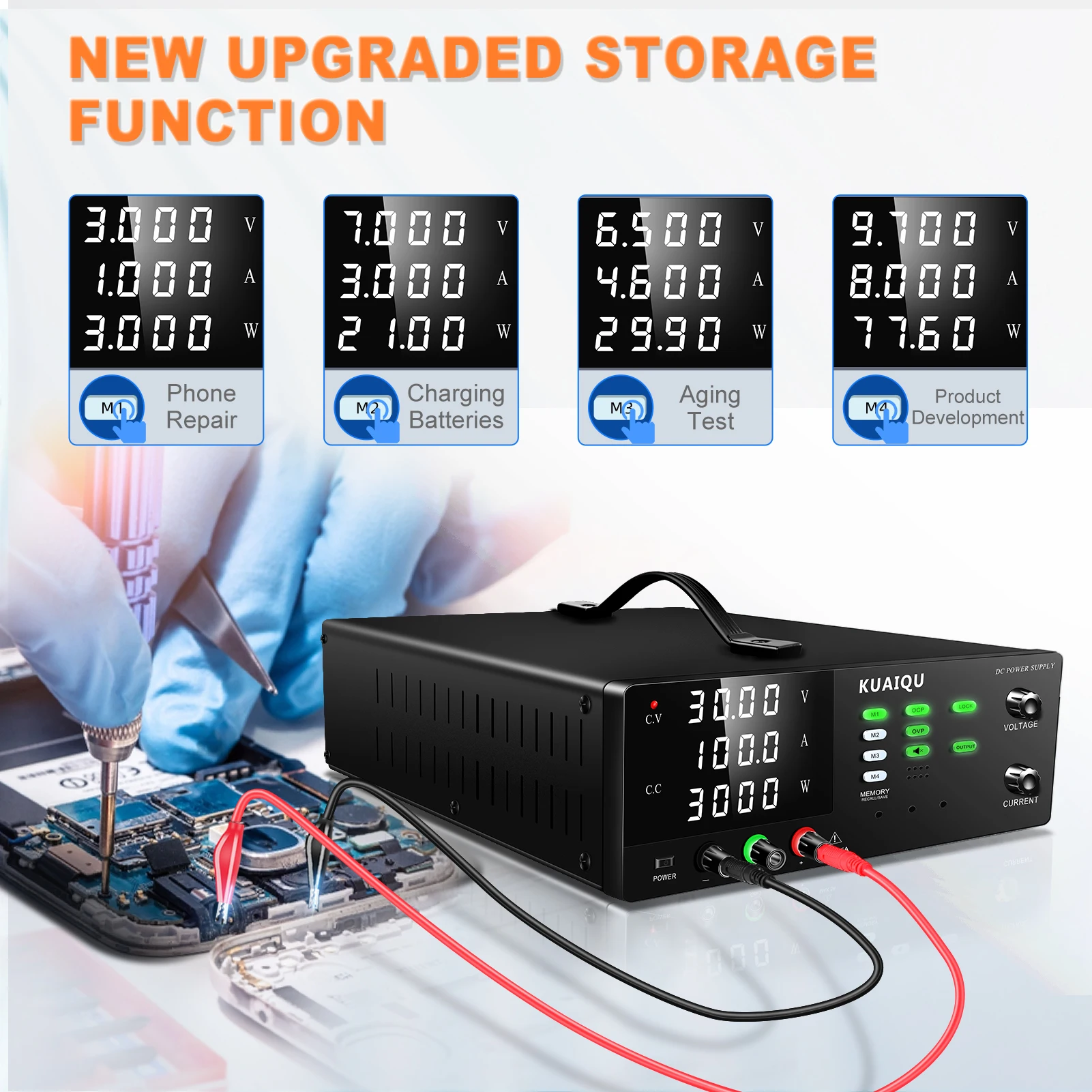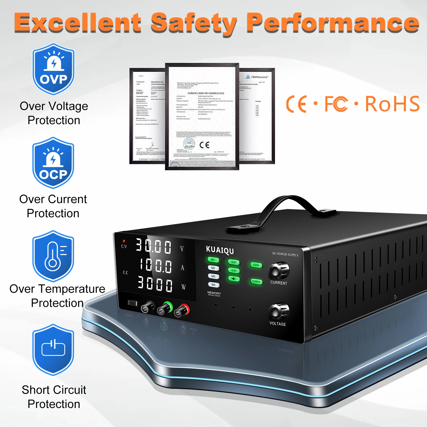 แหล่งจ่ายไฟแบบปรับค่าได้ KUAIQU 3000W กำลังสูง 1000V 300V 200V 100A 60A 30A สำหรับห้องปฏิบัติการ พร้อมระบบป้องกันกระแสเกิน (OCP) และป้องกันแรงดันเกิน (OVP) และสวิตช์ควบคุมการจ่ายไฟ
