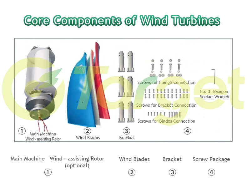 กังหันลม x1 (ตัวเครื่องหลัก + ใบพัด + ขายึด + สกรู + เครื่องมือติดตั้ง) + ตัวควบคุม x1 (ตัวควบคุม MPPT หรือตัวควบคุมไฮบริด MPPT Boost พร้อมโหลดดัมพ์)