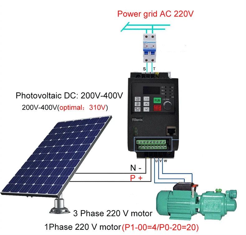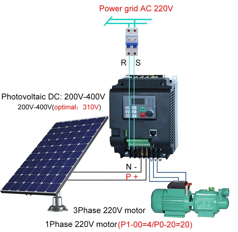 5. Regarding how to configure solar panels (assuming that the solar panels are configured as 24V 300W and the motor power is 4KW), such as 220V motors, the total voltage of solar panels in series meets DC 200V-400V (it is best to configure 320V), voltage calculation method: Take the best configuration 540V as an example, 540V/24V≈23. The power calculation method is: 1.2 times larger than the motor power, the solar panel power is 300W, the motor is 4KW, (4000X1.2)/300=16 (then the best configuration is to use 23, take the maximum value)