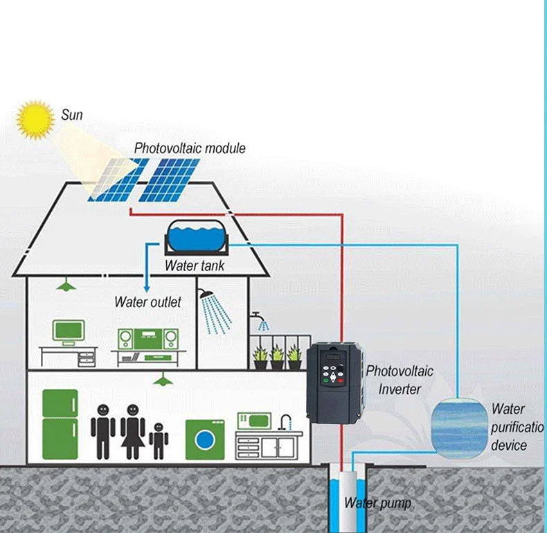 4. The solar inverter is only suitable for solar panels to generate power to drive fans, water pumps and other loads. It can be selected according to the voltage and power of the motor. If the depth of the submersible pump exceeds 30 meters, it is recommended to zoom in 1-2 levels.