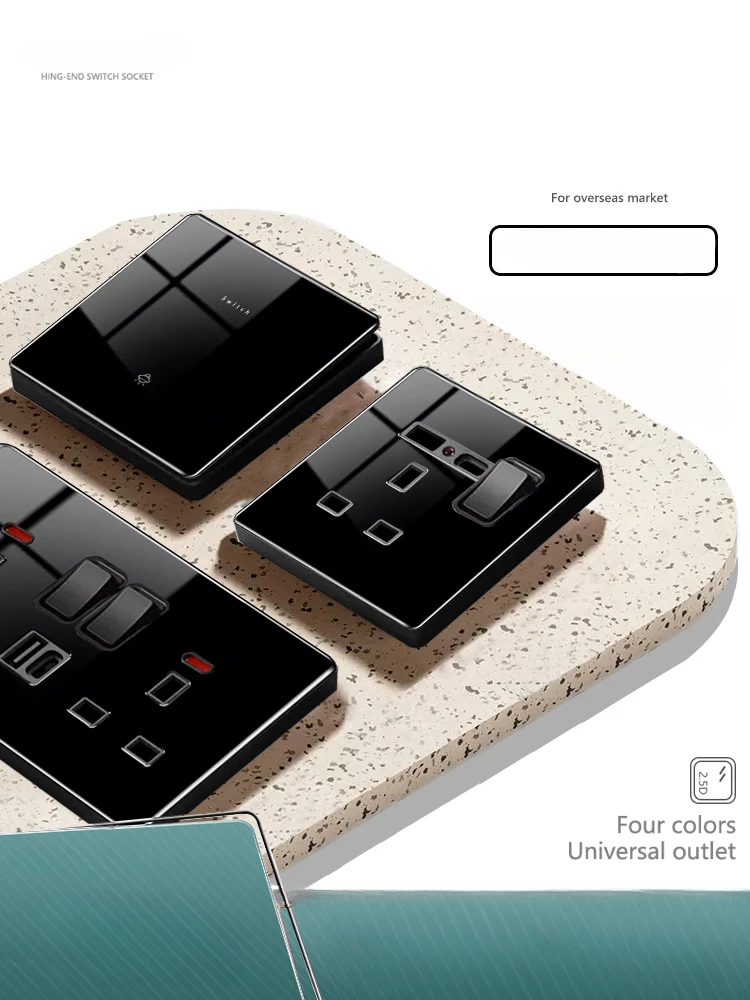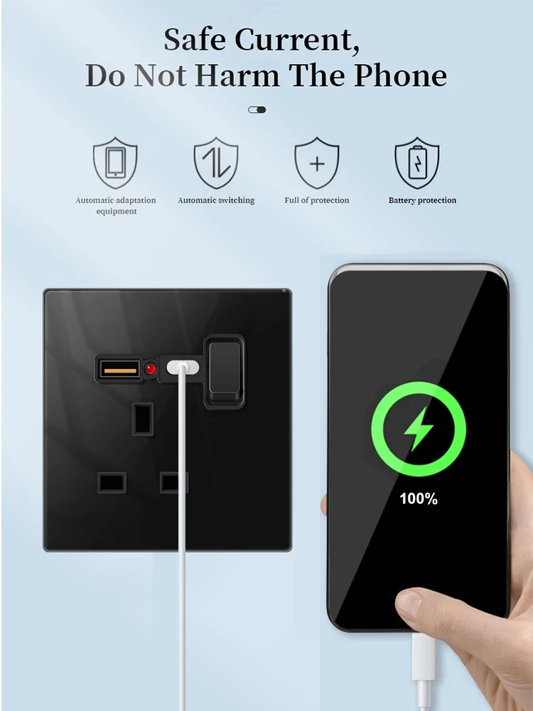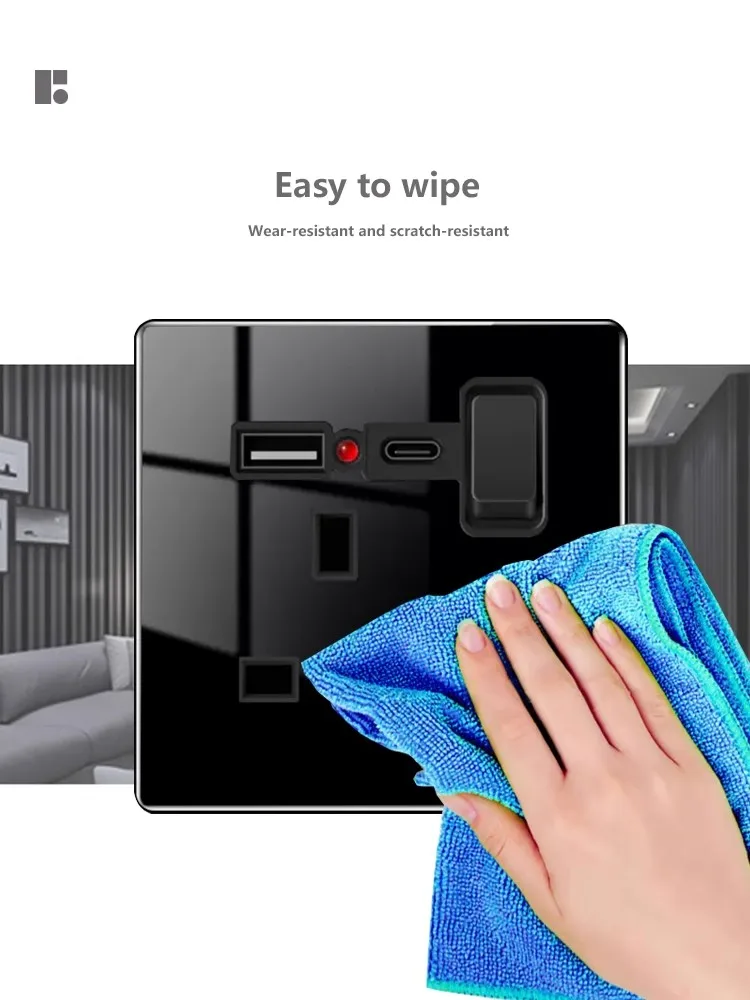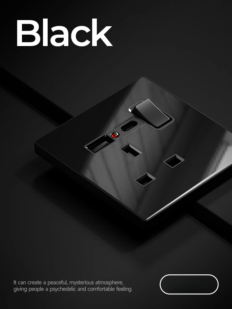 UK EU มาตรฐานสวิตช์ไฟผนังปลั๊กไฟประเภท C 2usb ซ็อกเก็ตสีดําทั้งหมดแผงกระจกนิรภัย 13A 3Pin ซ็อกเก็ต 2USB TypeC