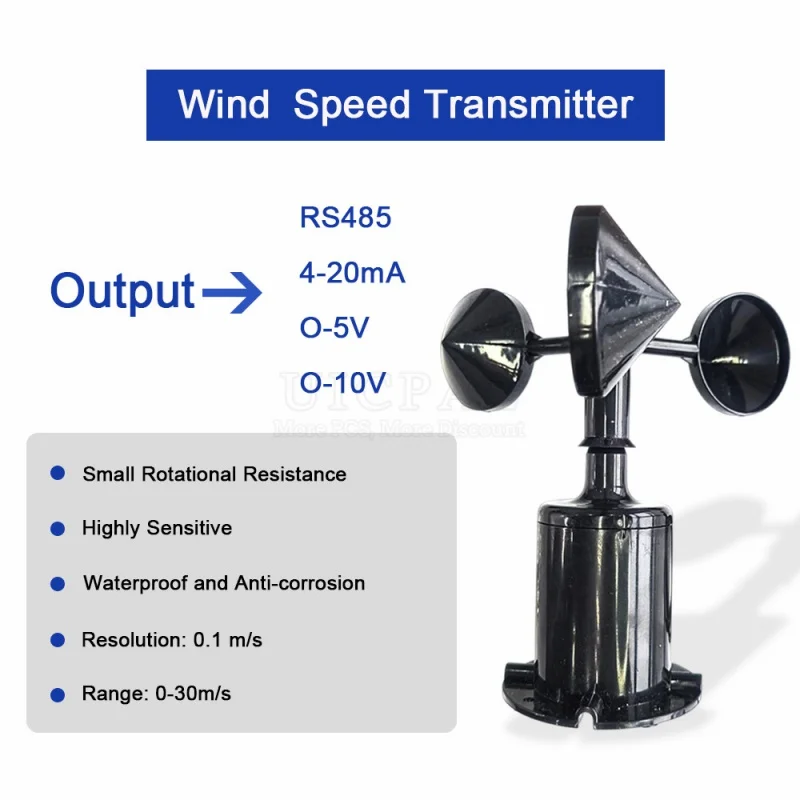 30 เมตร/วินาทีโพลีคาร์บอนความเร็วลมเซ็นเซอร์สถานีอากาศกลางแจ้ง 3 ถ้วยเครื่องวัดความเร็วลมเซนเซอร์เอาต์พุต RS485 4-20MA 0-5 โวลต์ 0-10 โวลต์