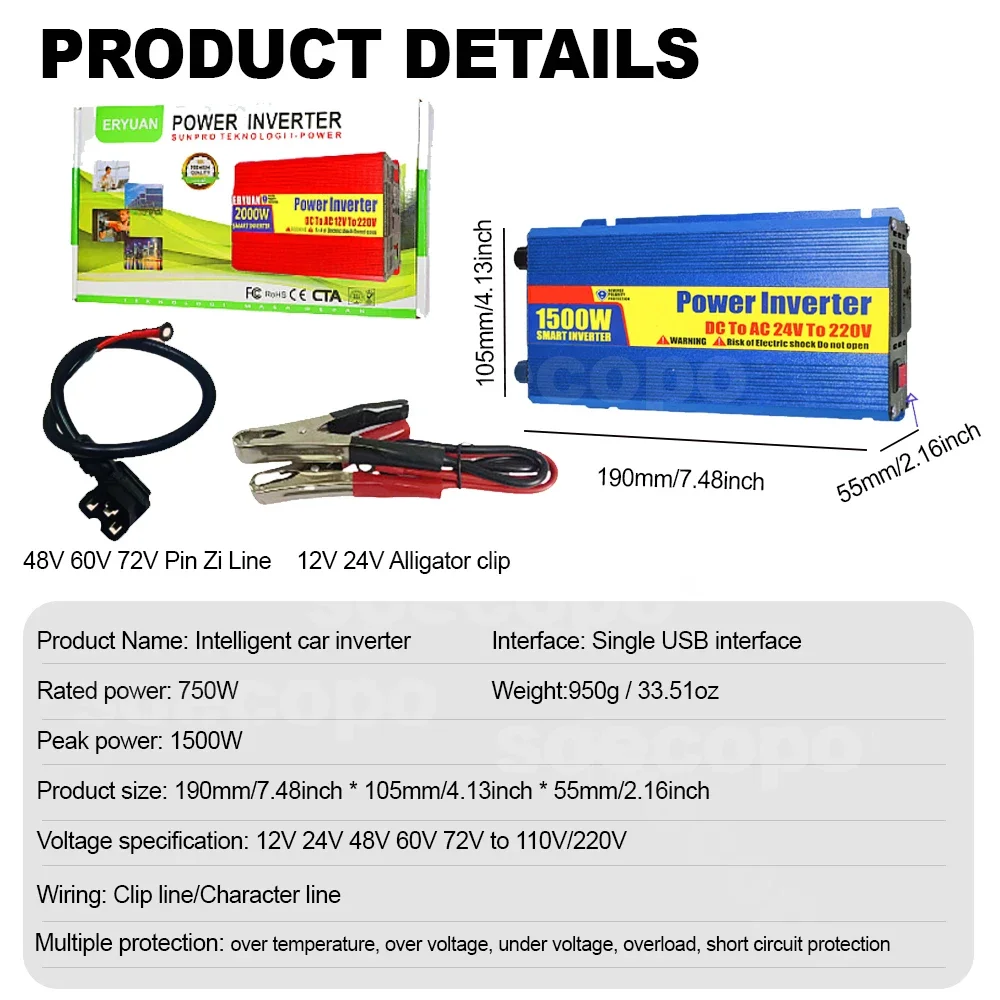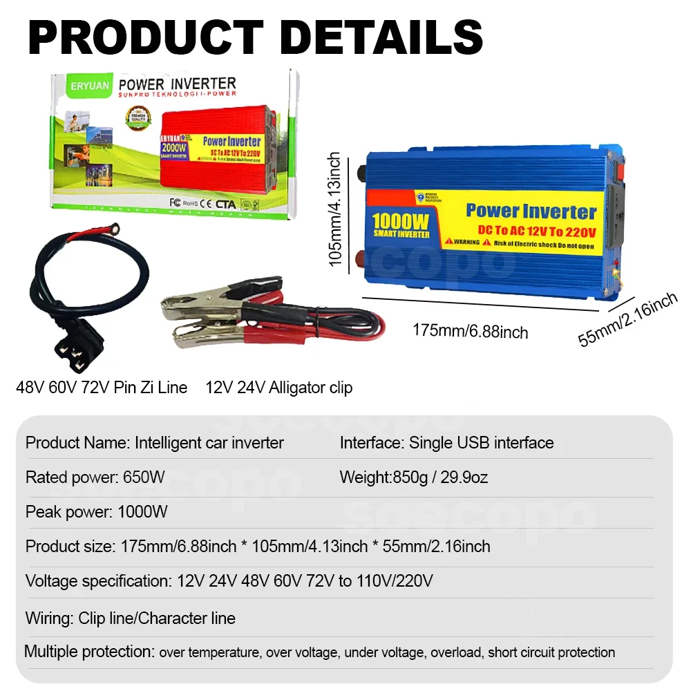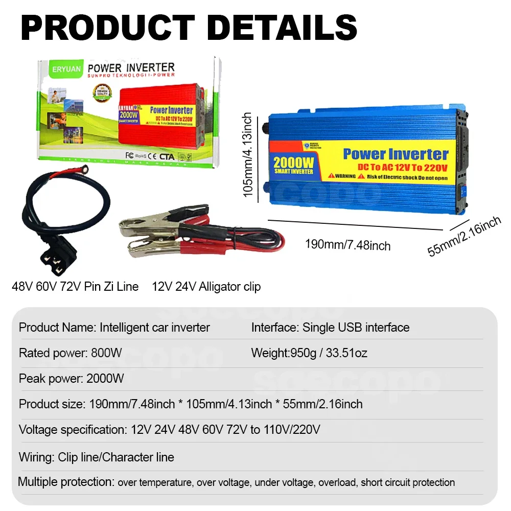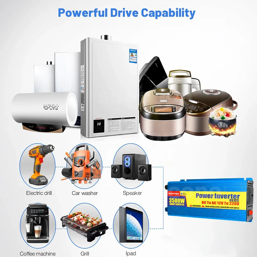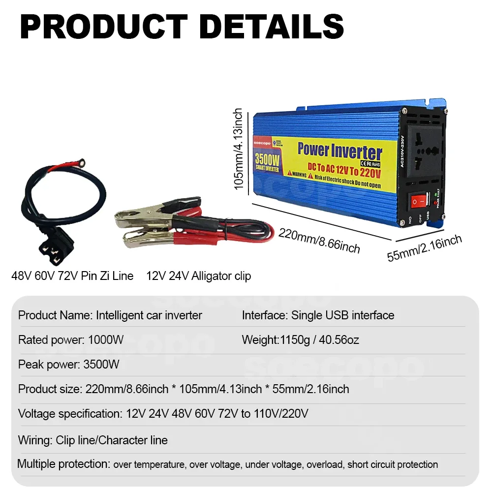 3500W รถอัจฉริยะอินเวอร์เตอร์ 12V 24V 48V 60V 72V ถึง 110V 220V พลังงานแสงอาทิตย์แบบพกพาสําหรับ Camping RV ฉุกเฉินกลางแจ้ง