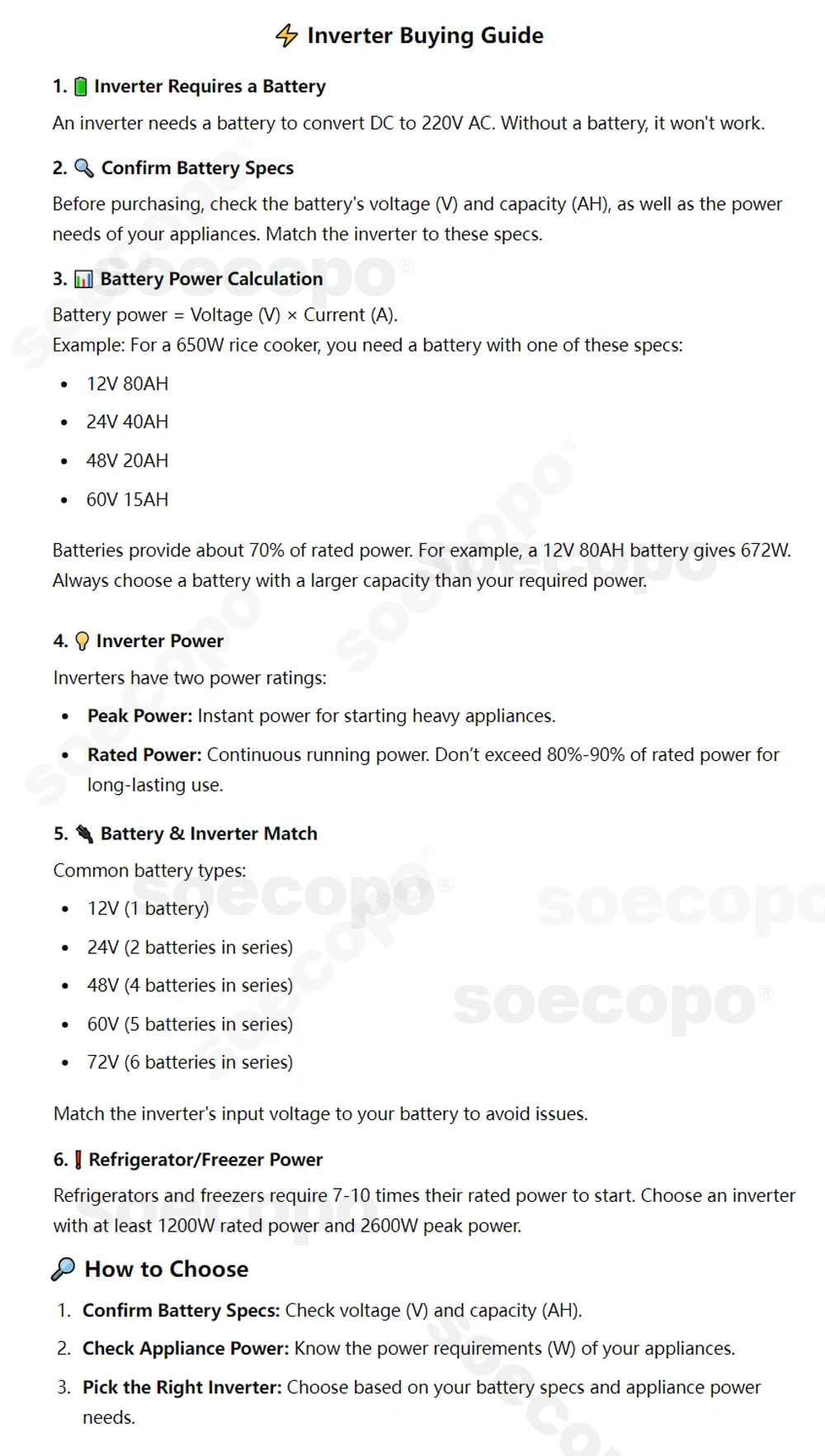 ตรวจสอบให้แน่ใจว่าความจุของแบตเตอรี่ที่เชื่อมต่อนั้นเพียงพอเพื่อประสิทธิภาพที่ดีที่สุด ให้ใช้แบตเตอรี่ขนาด 12V50AH ขึ้นไป
