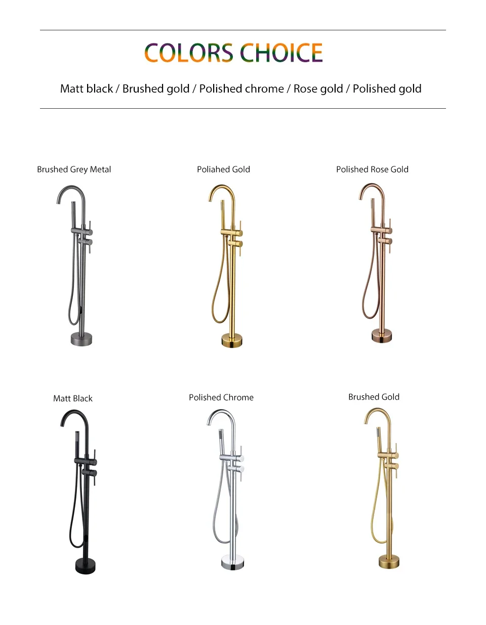 Black, brushed gold, polished gold, chrome, Polished Rose Gold |