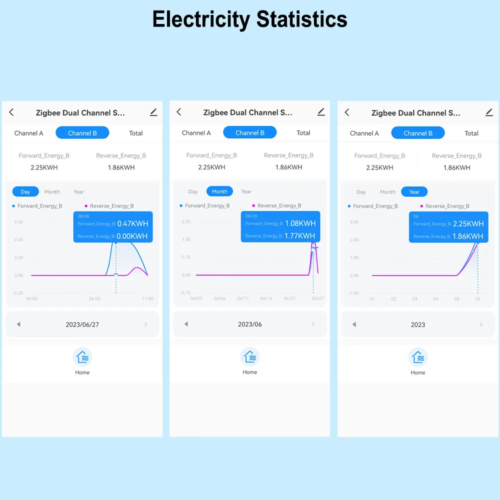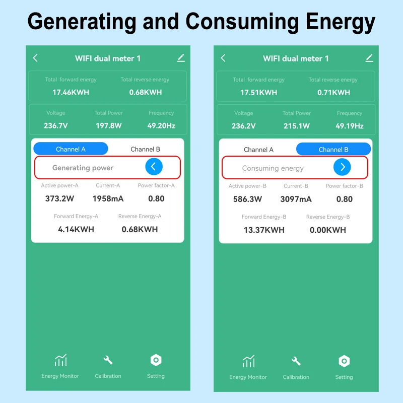 แอพสามารถแสดงช่อง A และ B พลังงานแบบเรียลไทม์ กระแส แรงดันไฟฟ้าสําหรับทิศทางไปข้างหน้าและย้อนกลับได้อย่างชัดเจน