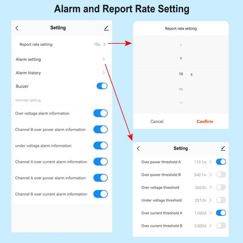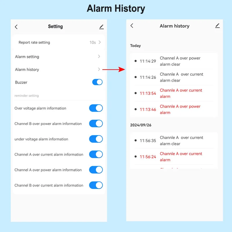 App ตั้งค่าเกณฑ์สําหรับแรงดันไฟฟ้า กระแส และพลังงาน เมื่อค่าถึงค่า อุปกรณ์สามารถส่งเสียงเตือนและแอปสามารถส่งข้อความเตือนได้คุณสามารถตรวจสอบประวัติการเตือนได้บน App