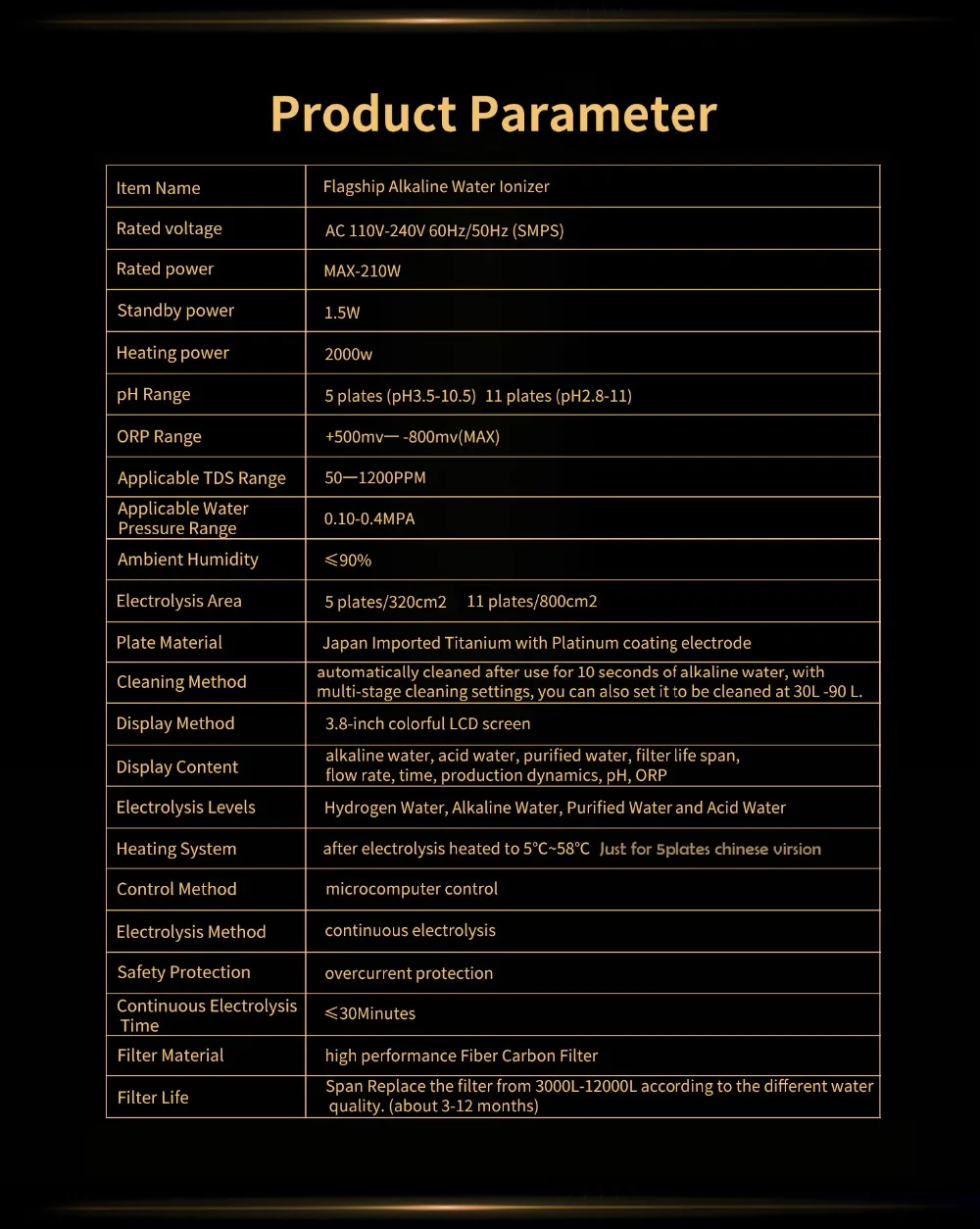 7.ไทเทเนียม11ชิ้นพร้อมแผ่นเคลือบแพลตตินัมใช้กับเยื่อบุไอออนิกที่นำเข้าจากประเทศญี่ปุ่นให้ประสิทธิภาพการอิเล็กโทรไลซิสที่สูงขึ้นและอายุการใช้งานที่ยาวนานขึ้น -