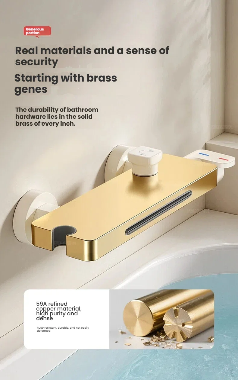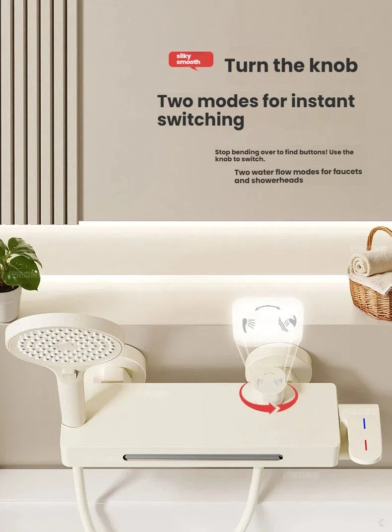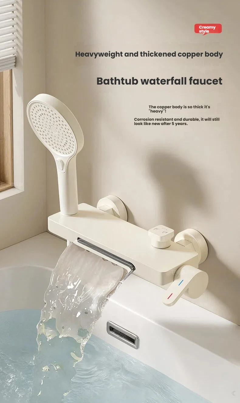 ก๊อกน้ำตกอ่างอาบน้ำสีขาวนม พร้อมปุ่มควบคุมการไหลของน้ำแบบแรง สำหรับเปลี่ยนระหว่างน้ำร้อนและน้ำเย็น ชุดฝักบัว