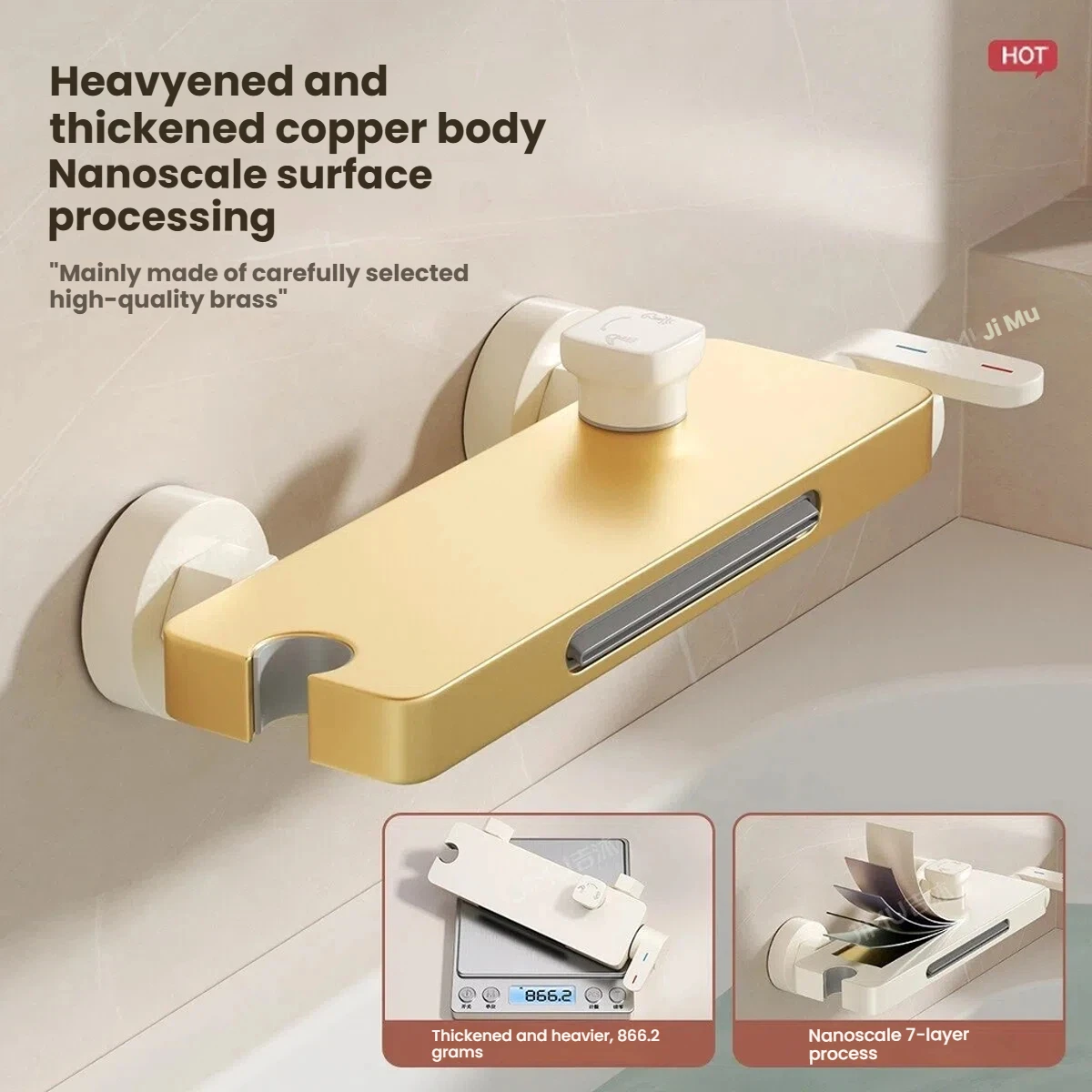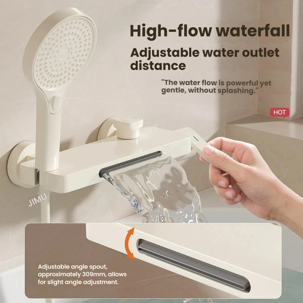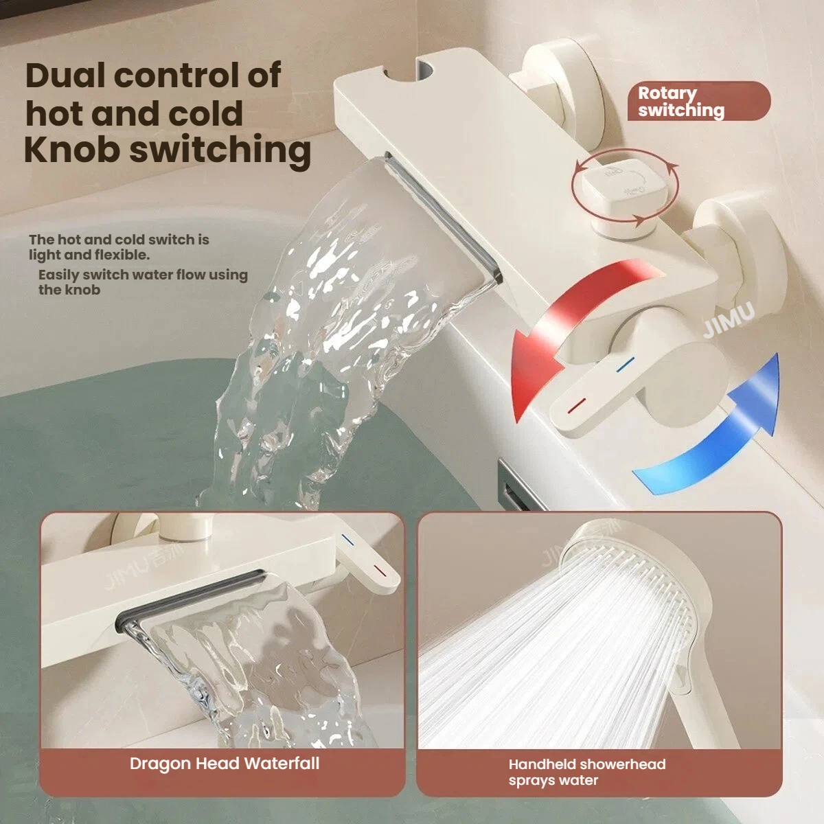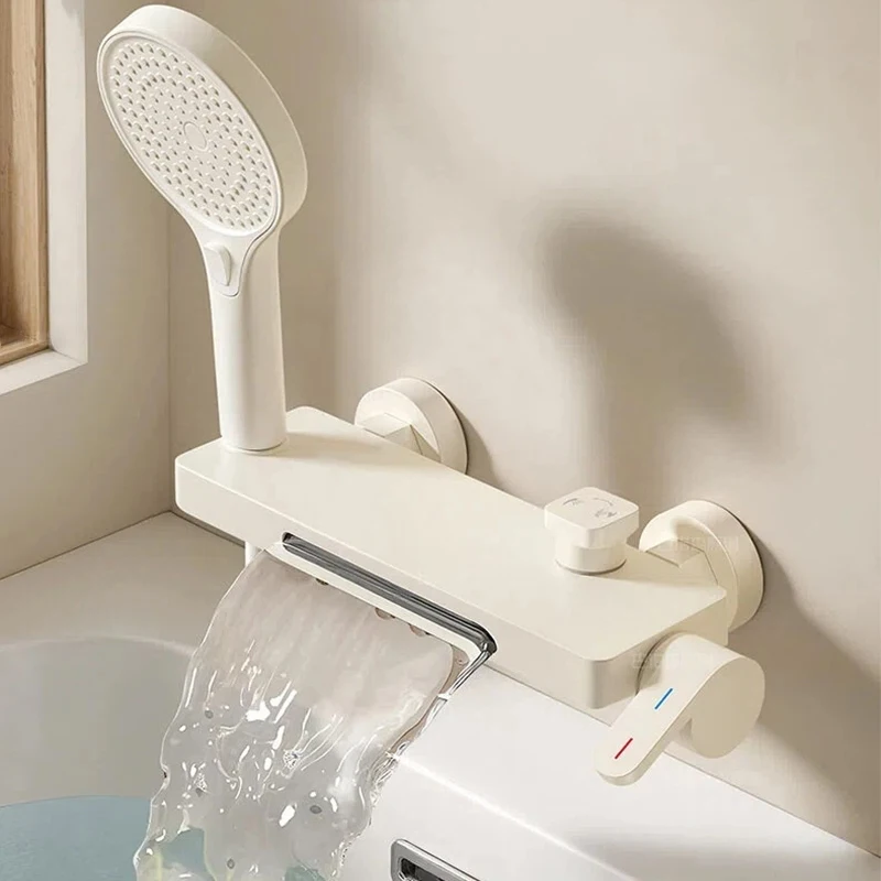 ก๊อกน้ำตกอ่างอาบน้ำสีขาวนม พร้อมปุ่มควบคุมการไหลของน้ำแบบแรง สำหรับเปลี่ยนระหว่างน้ำร้อนและน้ำเย็น ชุดฝักบัว