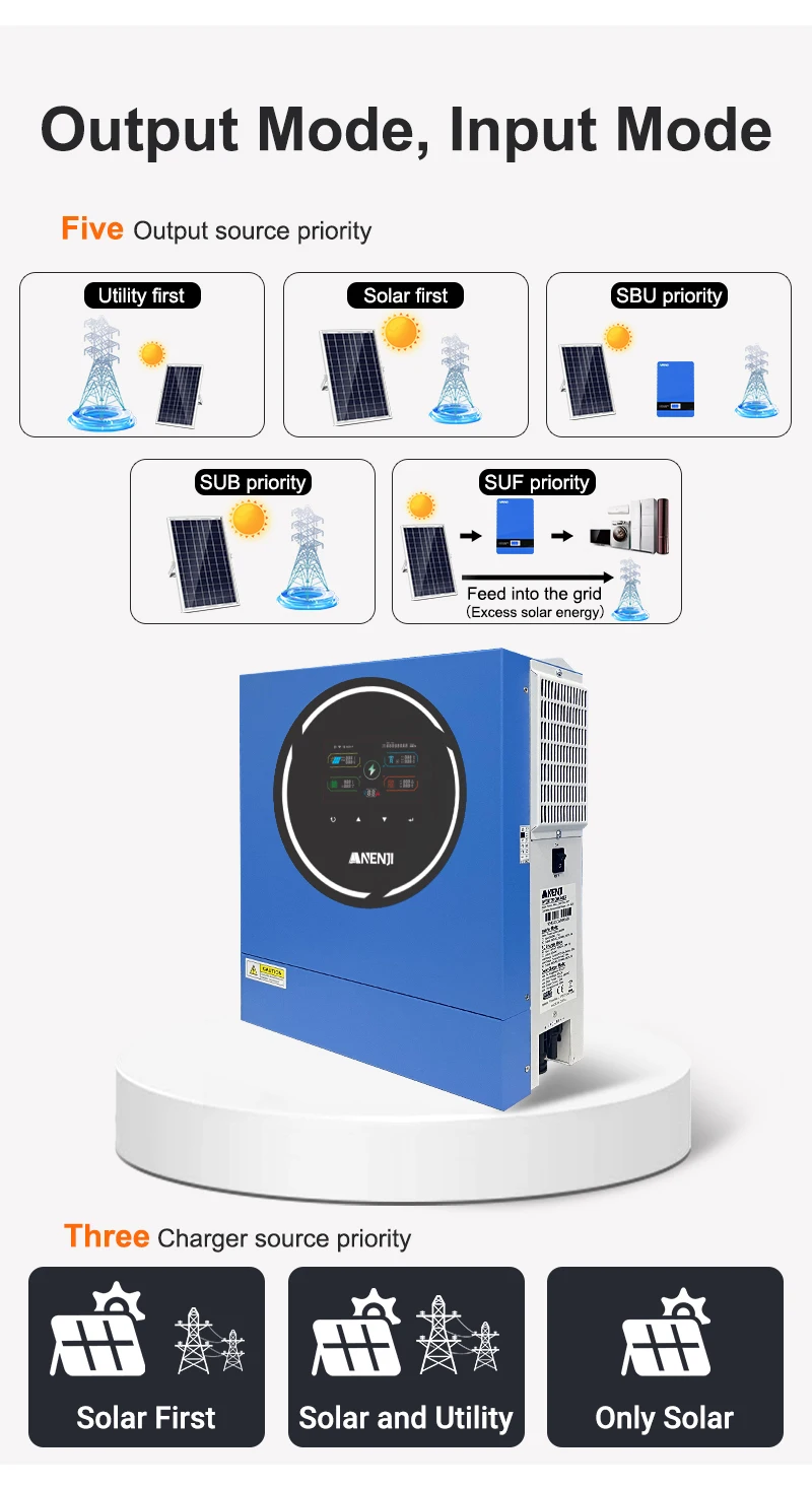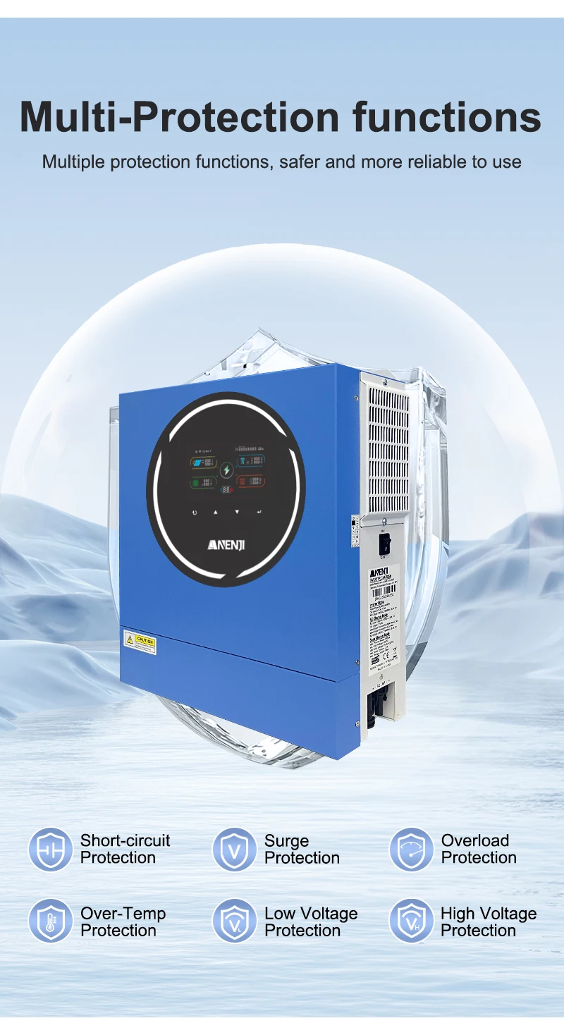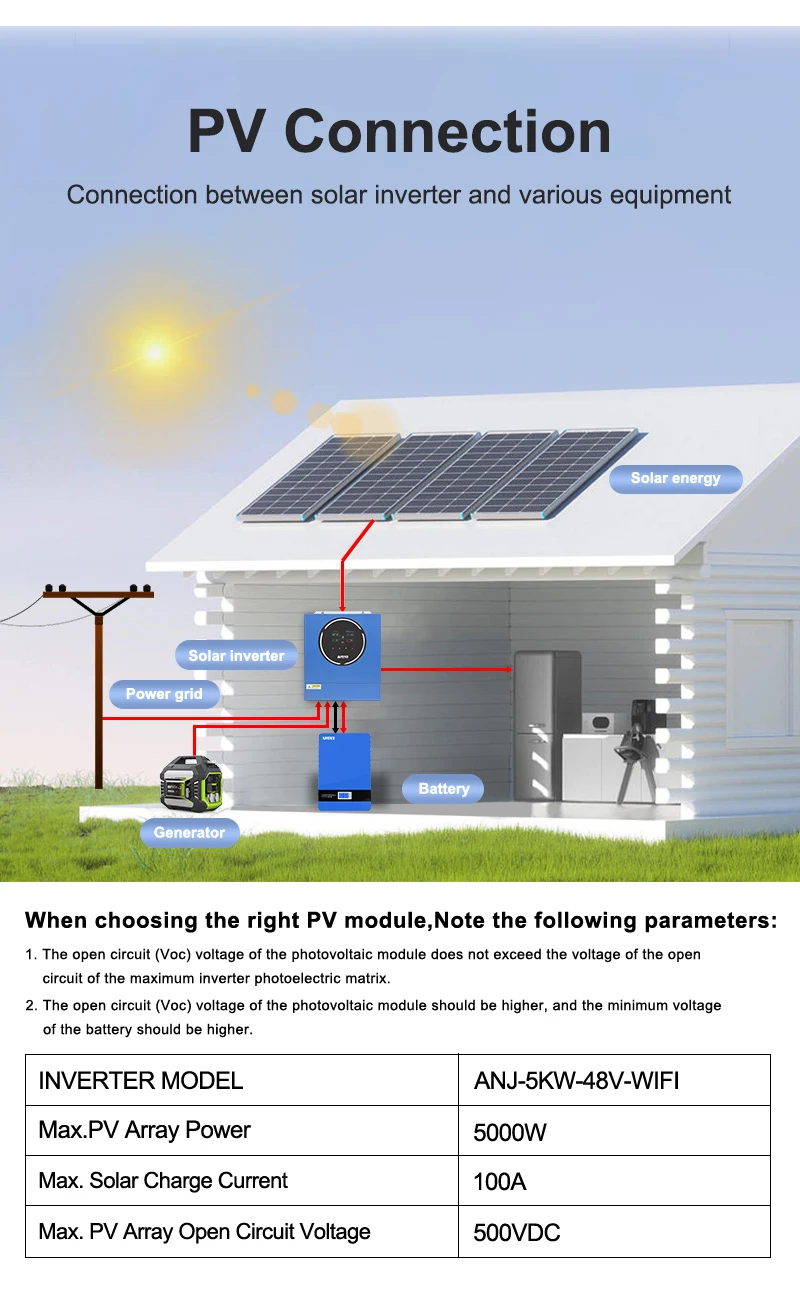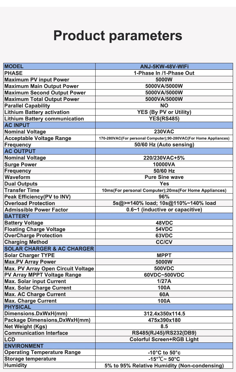อินเวอร์เตอร์ไฮบริดพลังงานแสงอาทิตย์ ANENJI 5KW 48V 220V/230VAC MPPT 100A พร้อม WIFI ในตัว รองรับไฟฟ้าสองระบบ Pure Sine Wave PV 500V ใช้ได้ทั้งแบบ On Grid และ Off Grid