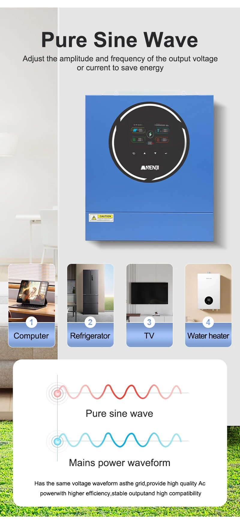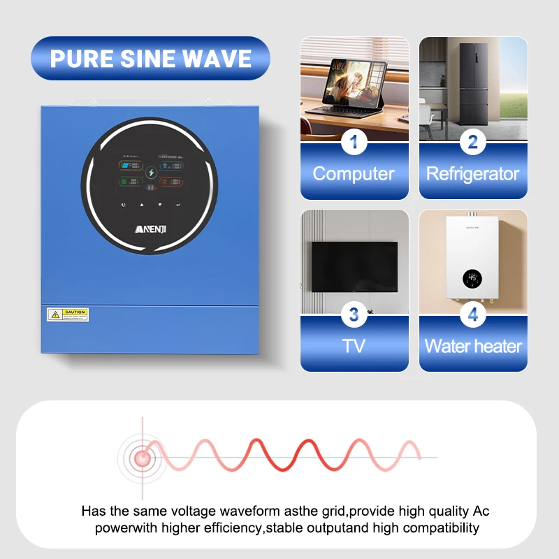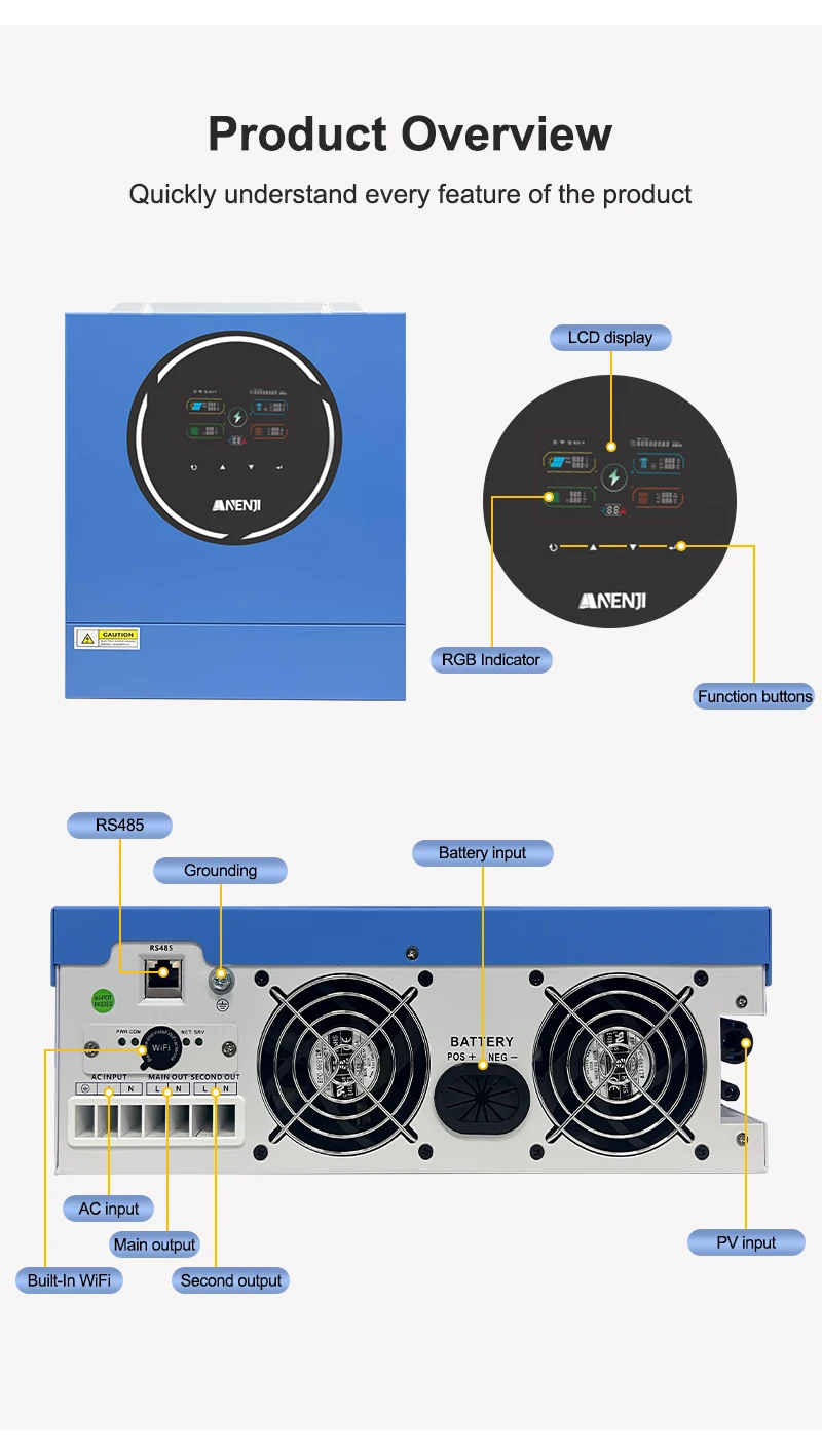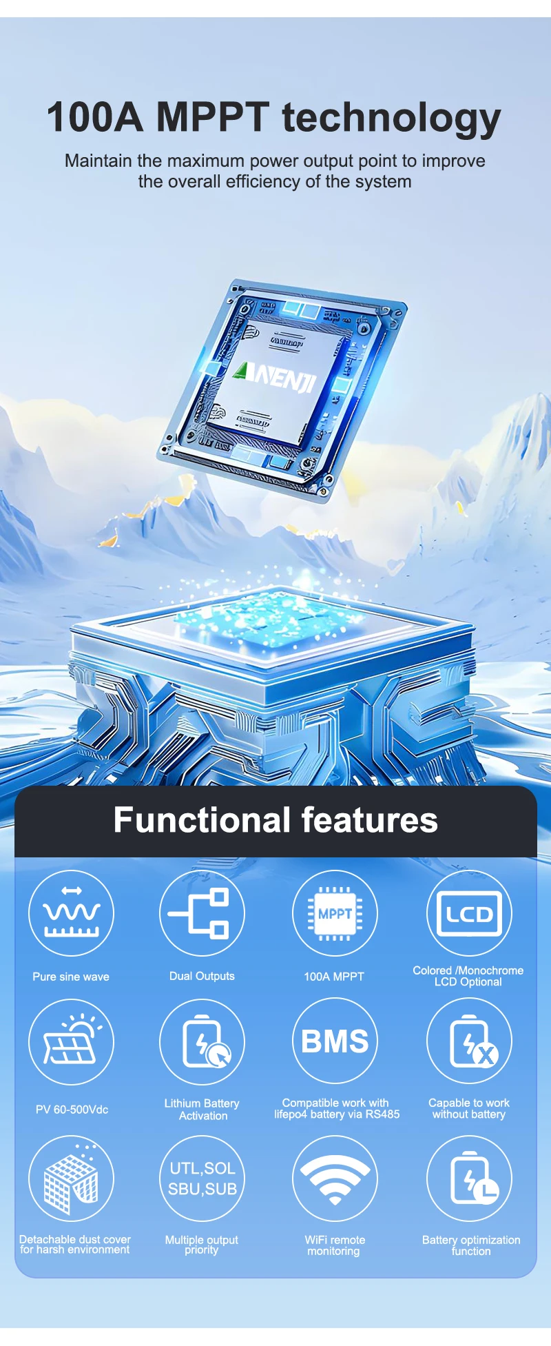 อินเวอร์เตอร์ไฮบริดพลังงานแสงอาทิตย์ ANENJI 5KW 48V 220V/230VAC MPPT 100A พร้อม WIFI ในตัว รองรับไฟฟ้าสองระบบ Pure Sine Wave PV 500V ใช้ได้ทั้งแบบ On Grid และ Off Grid