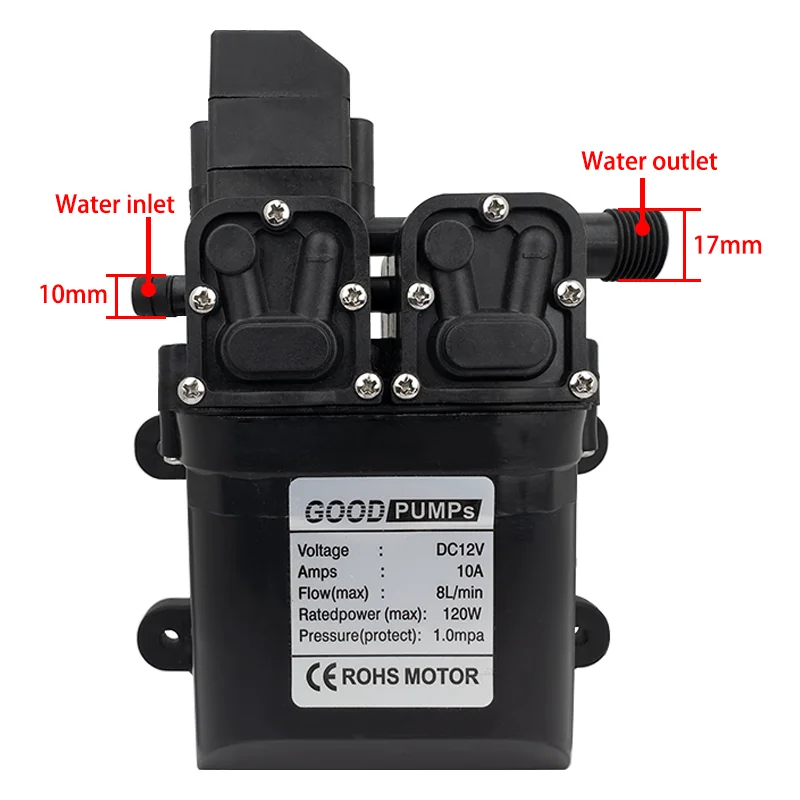 ทนทานแรงดันสูงปั๊มน้ําไดอะแฟรม DC 12V 120W 8L/Min แรงดันสูง Self-priming ปั๊มน้ําไดอะแฟรมอัตโนมัติ