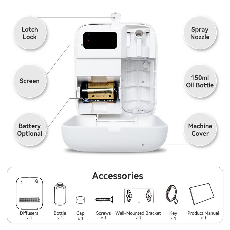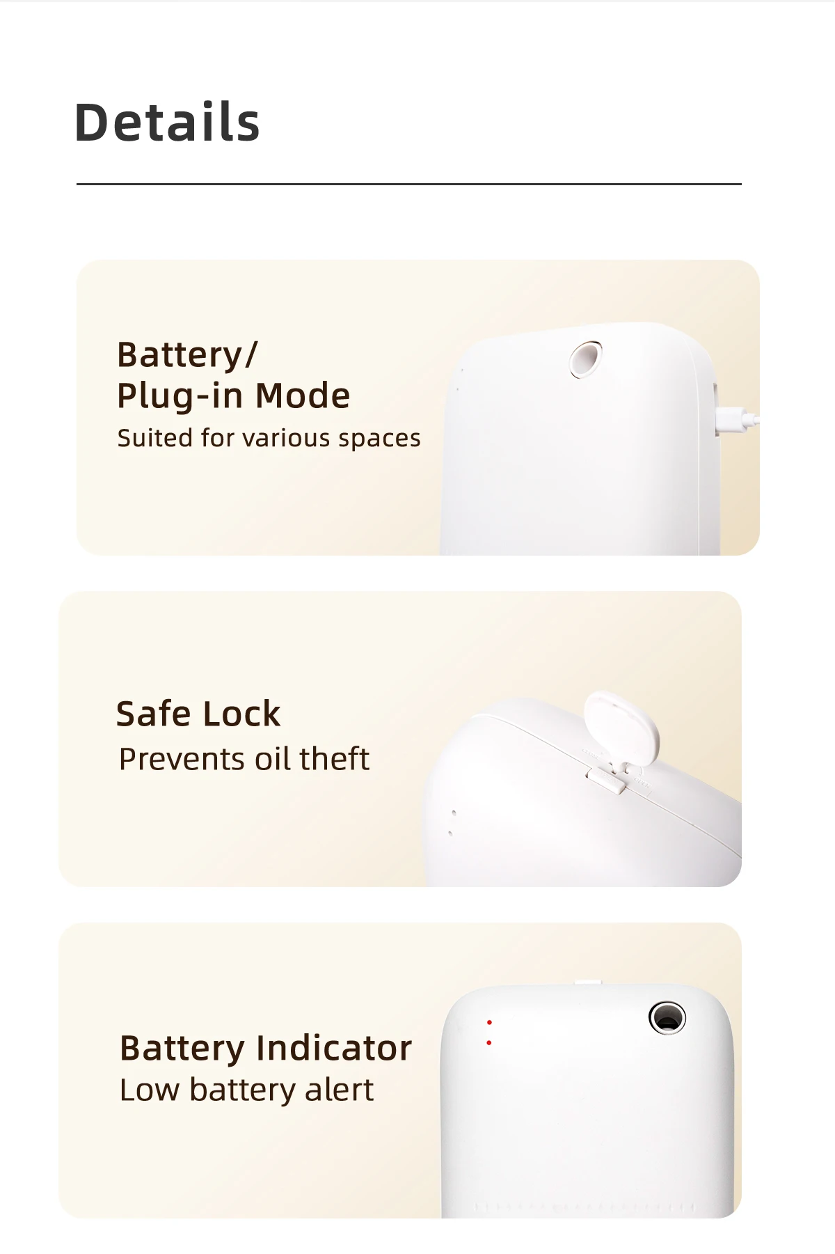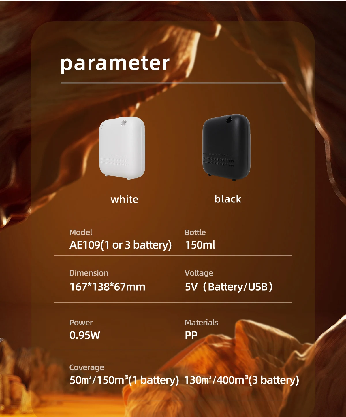 เหมาะสำหรับใช้กับเครื่องกระจายกลิ่นในบ้านในห้องนั่งเล่น ห้องนอน หรือเป็นเครื่องกระจายกลิ่นเชิงพาณิชย์ในสำนักงาน สปา และร้านเสริมสวย เทคโนโลยีอัลตราโซนิกช่วยให้มั่นใจได้ถึงการทำงานที่เงียบสนิท เลือกสีขาวหรือสีดำสุดคลาสสิก เครื่องกระจายกลิ่นหอมแบบชาร์จไฟได้, เครื่องกระจายกลิ่นหอมแบบใช้แบตเตอรี่, เครื่องกระจายกลิ่นหอม, เครื่องกระจายกลิ่นหอมในห้อง, เครื่องอโรม่า, เครื่องจ่ายน้ำหอม, ไม่ต้องใช้น้ำ