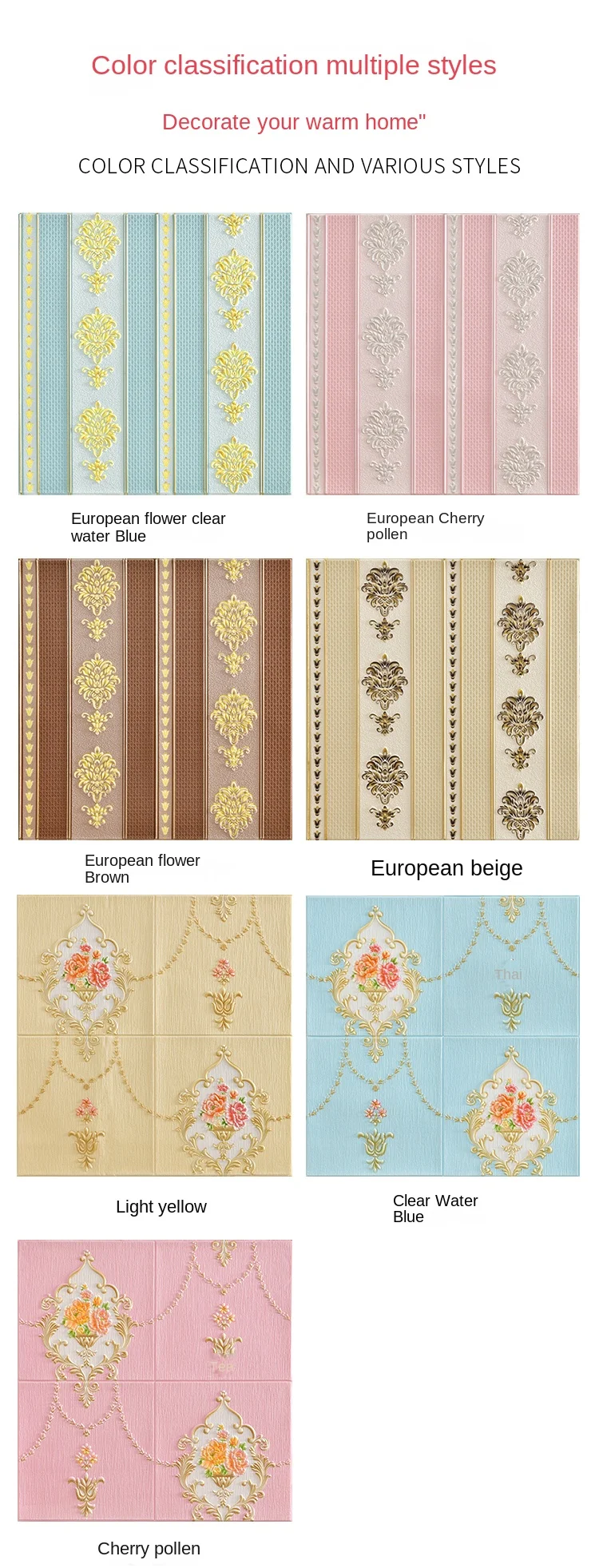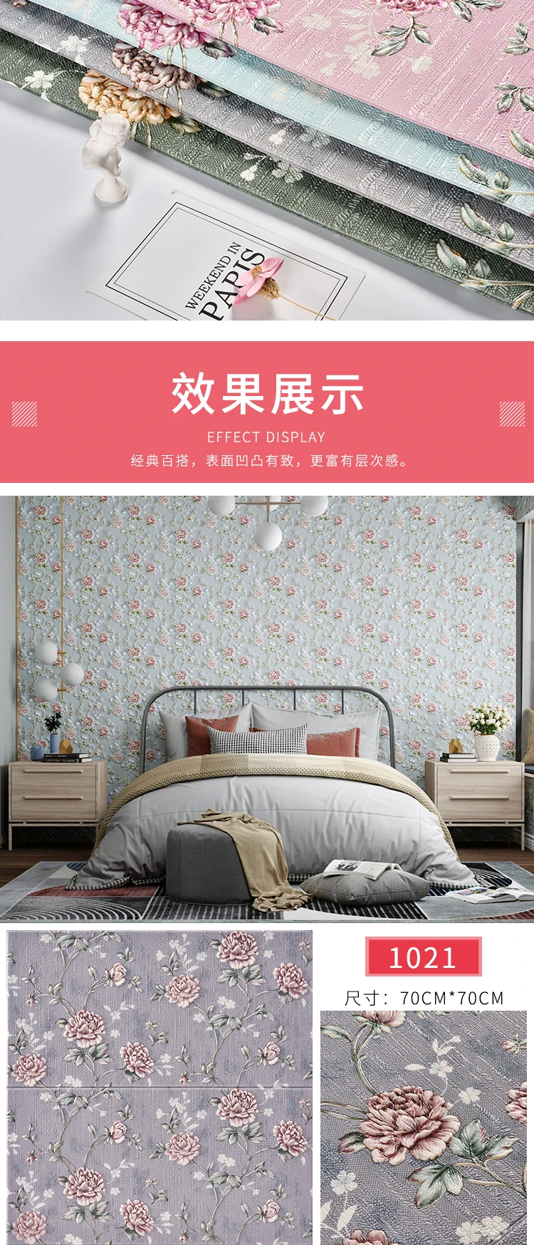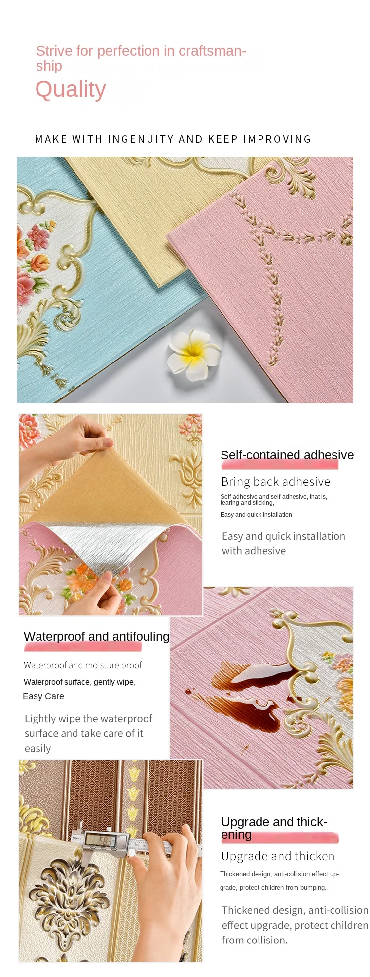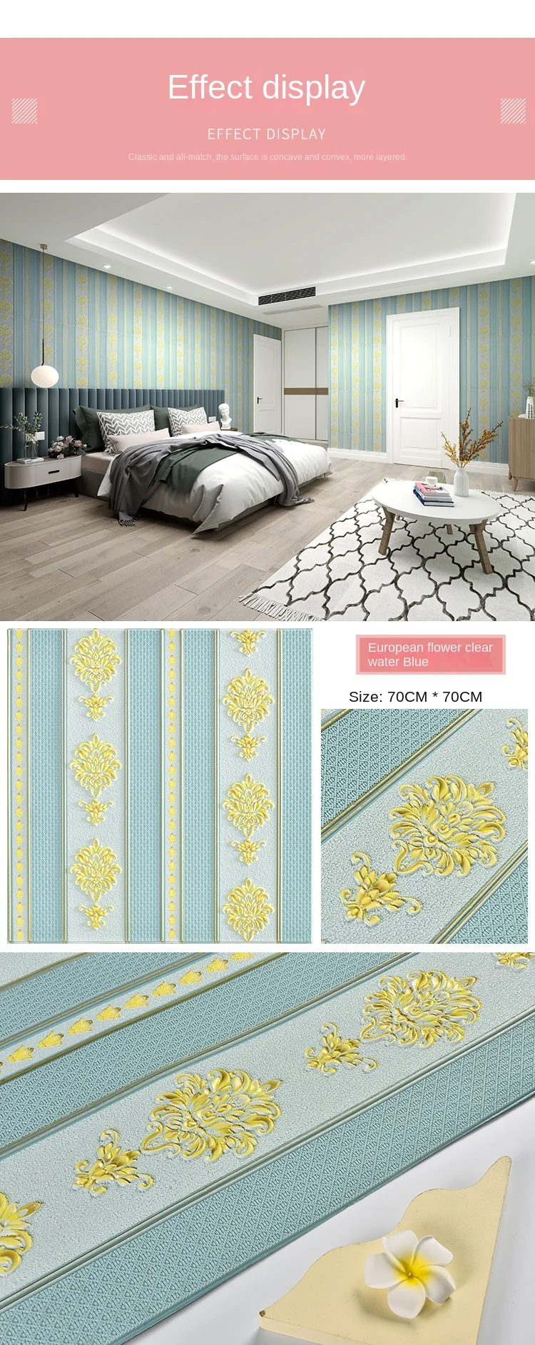 สติ๊กเกอร์ติดผนังสามมิติวอลล์เปเปอร์แบบมีกาวในตัว 3 มิติไม่ได้เป็นเพียงการตกแต่งในพื้นที่ของคุณ แต่เป็นข้อพิสูจน์ถึงความคล่องตัวและความทนทานสติกเกอร์ติดผนังเหล่านี้ผลิตจากวัสดุ EPP คุณภาพสูง ได้รับการออกแบบมาให้ทนทานต่อความรุนแรงในชีวิตประจําวัน ในขณะที่ยังคงรักษารูปแบบดอกไม้ที่มีชีวิตชีวาไว้การรักษาพื้นผิวนูนช่วยเพิ่มมิติสัมผัสให้กับวอลเปเปอร์ เพิ่มความดึงดูดสายตา และทําให้ห้องนี้โดดเด่นในทุกห้อง